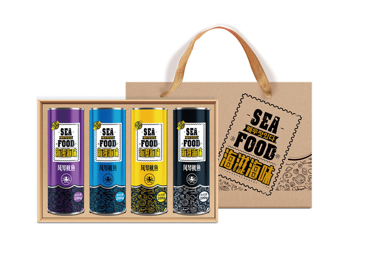 打造這個禮盒的目的是搭配自魷人目前現有的門店渠道,帶動禮盒產品的銷售,里面分別裝有不同的招牌產品,如果來廣州想帶點手信,這款海產品也是不錯的選擇。設計的方向:突出產品的原生態(tài),健康天然的理念。