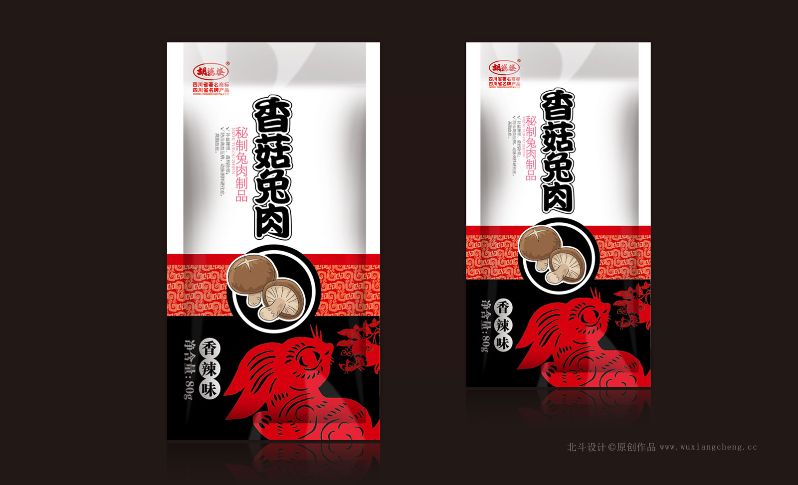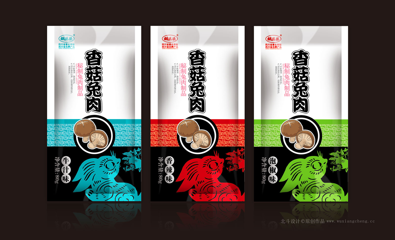 胡婆婆香菇兔肉系列分為3個產(chǎn)品:牛汁味,香辣味,泡椒味。為了能夠把控胡婆婆大家族品牌認(rèn)知體系,我們保留了胡婆婆特有的品牌底紋符號。