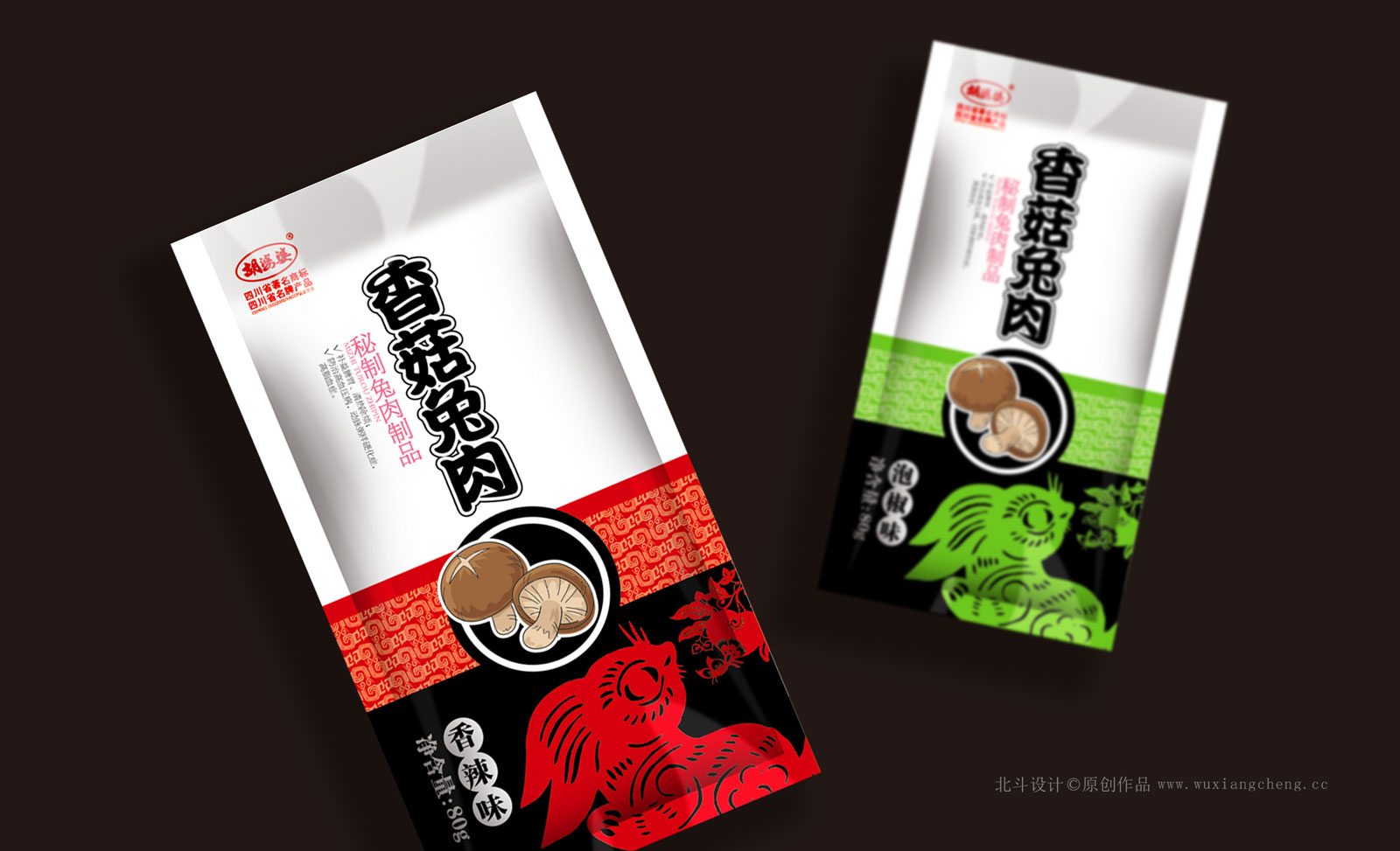 Hu mother-in-law mushroom rabbit series is divided into three: cow juice taste and fragrant spicy, pickled flavor. In order to be able to handle the mother-in-law hu family brand recognition system, we will keep the hu mother-in-law particular background brand symbol.
