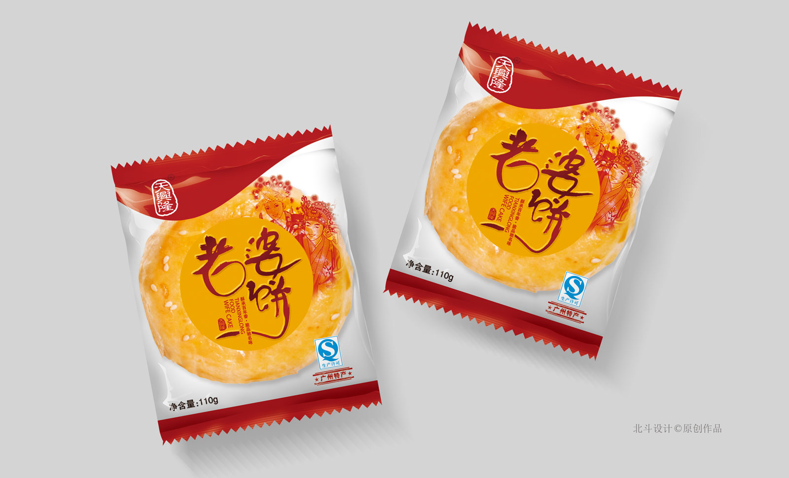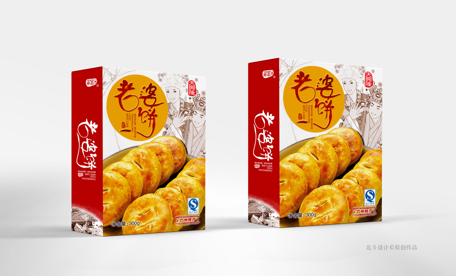北斗品牌設(shè)計(jì)此次為其設(shè)計(jì)的老婆餅包裝設(shè)計(jì)主要采取的是傳統(tǒng)的設(shè)計(jì)風(fēng)格,老婆餅是中國(guó)傳統(tǒng)喜餅里的一種,所以從元素的選用方面,北斗設(shè)計(jì)選用了傳統(tǒng)的新郎官和新娘,然后經(jīng)過(guò)手繪的表現(xiàn)手法,配合紅色的背景來(lái)體現(xiàn)出畫(huà)面的喜慶氣氛,同時(shí)配合毛筆字的主題設(shè)計(jì),讓整個(gè)畫(huà)面更加活躍和諧。此款老婆餅推出市場(chǎng)后,收到了消費(fèi)者很好的口碑,同時(shí)在銷量方面天興隆也表示很不錯(cuò)。