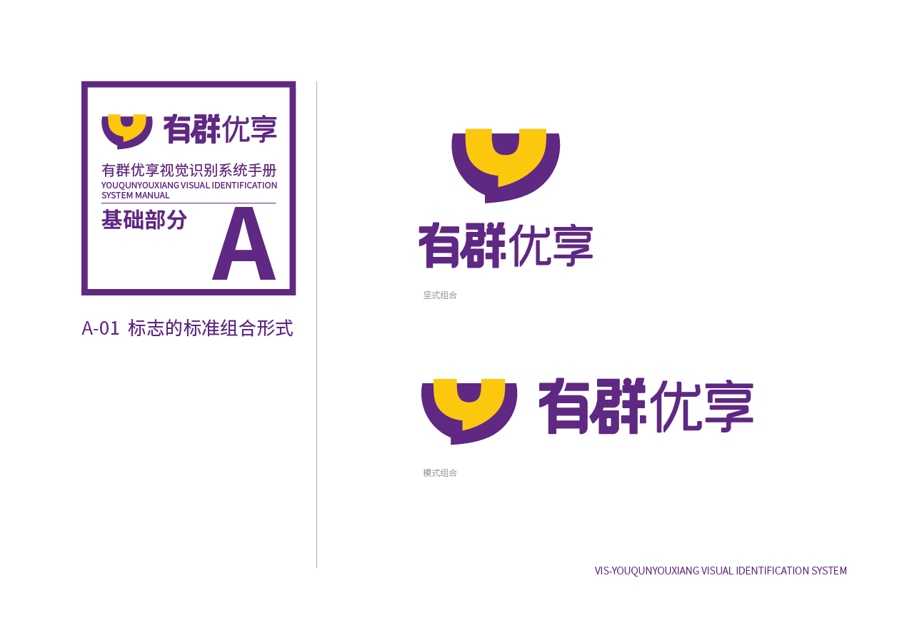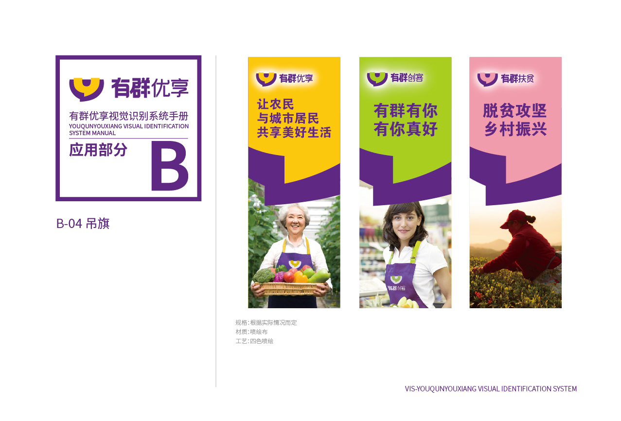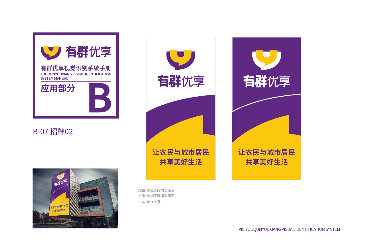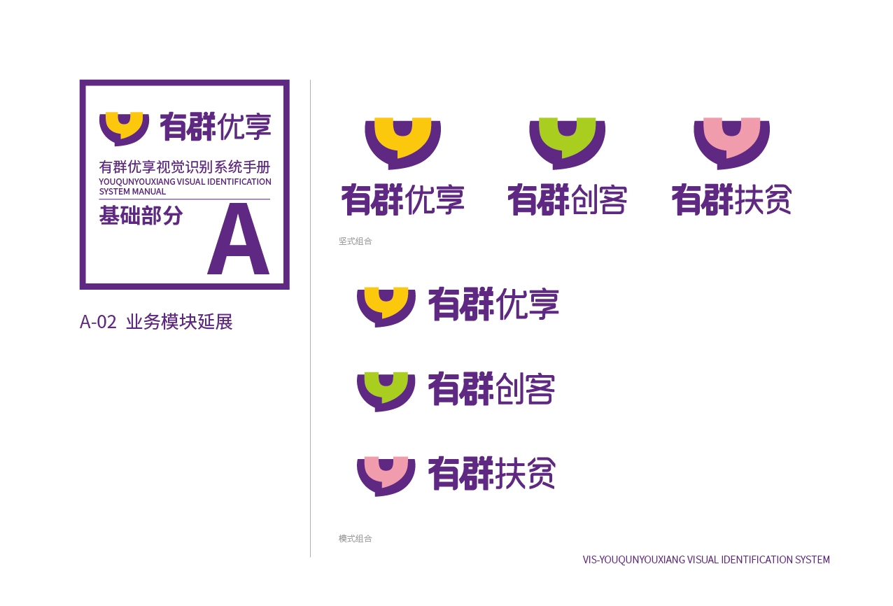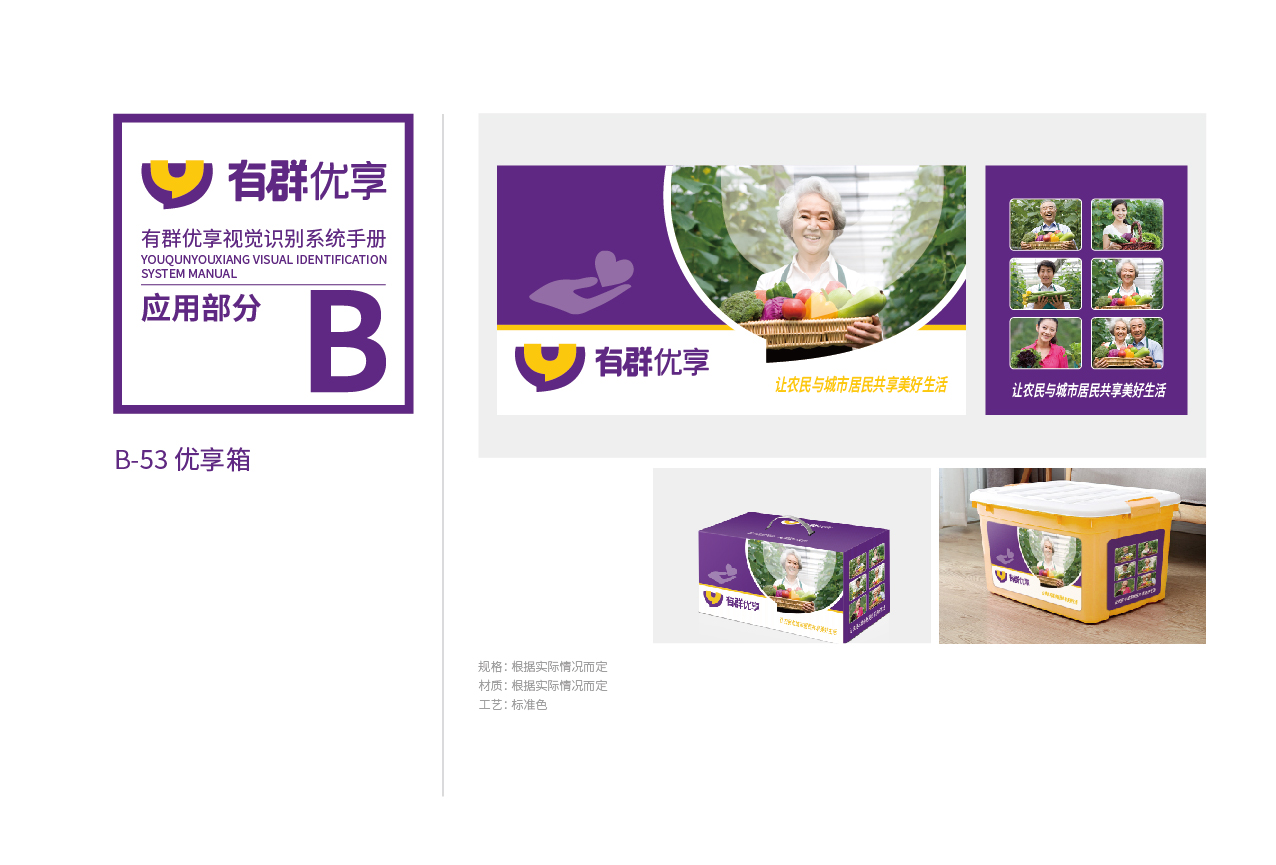 有群優(yōu)享是針對城市居民與農(nóng)民流通農(nóng)產(chǎn)品所建立傳播的品牌名稱。廣告語:讓城市居民與農(nóng)民共享美好生活。而有群創(chuàng)客及有群扶貧是針對企業(yè)內(nèi)部的傳播以及響應(yīng)政府的扶持政策。所以整個品牌的系統(tǒng)聚焦是有群優(yōu)享的視覺傳播。
