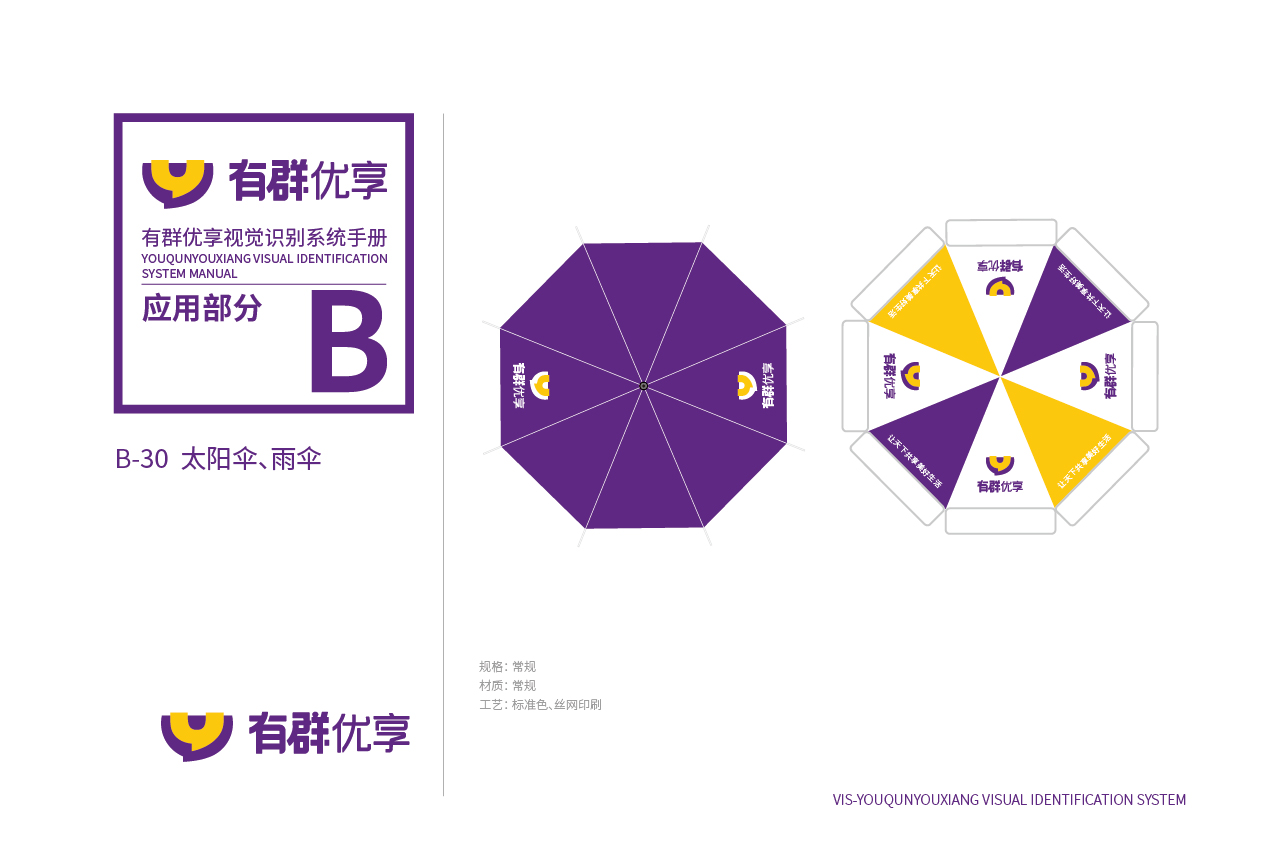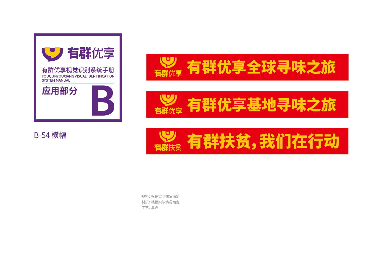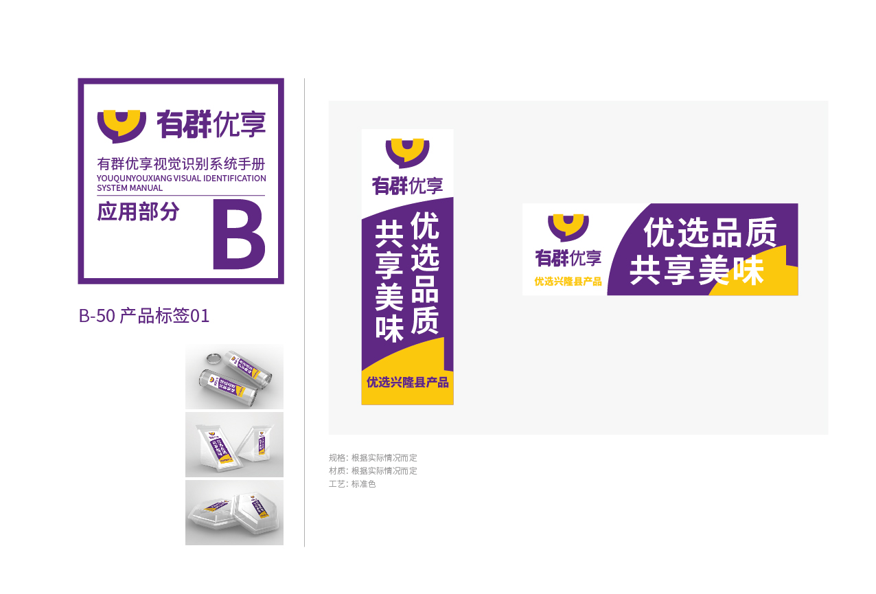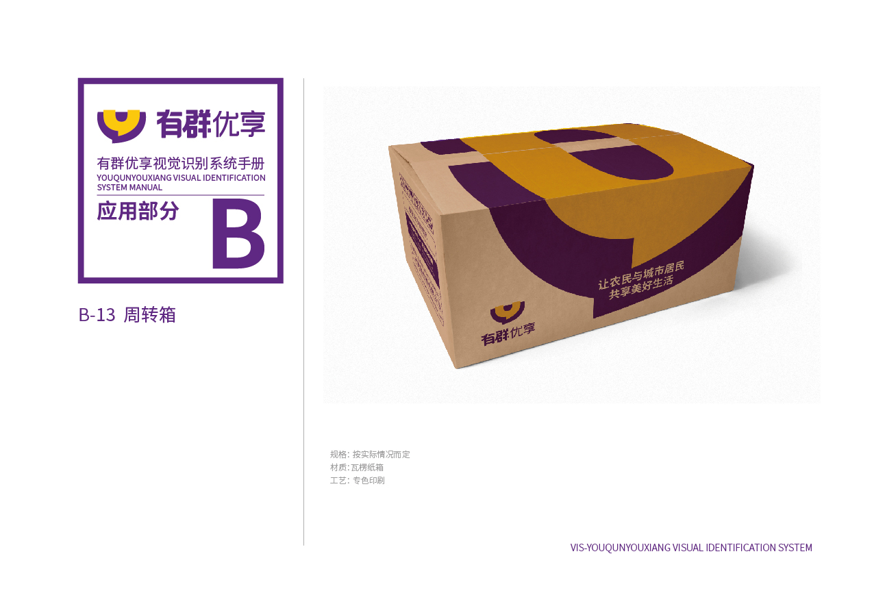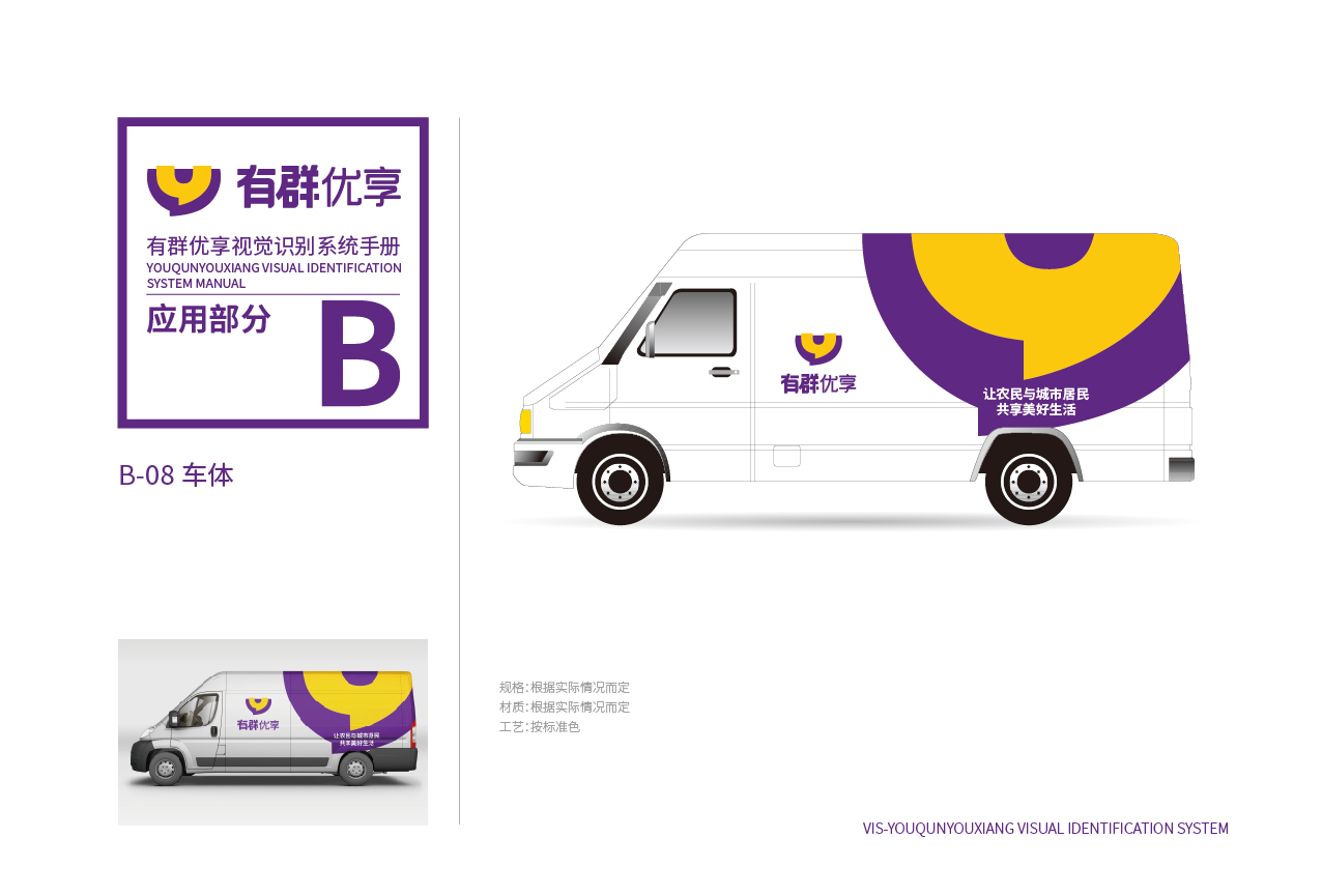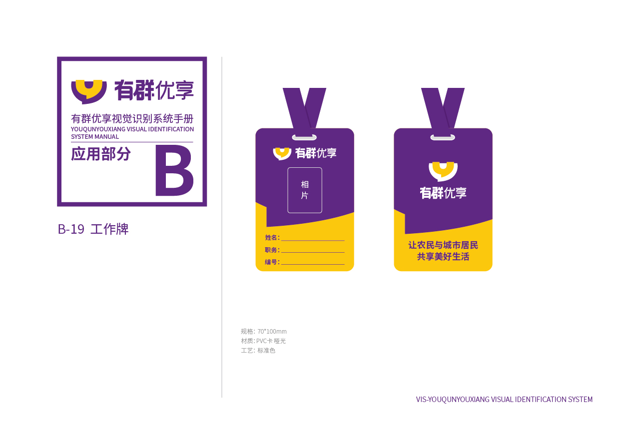 有群優(yōu)享是針對城市居民與農(nóng)民流通農(nóng)產(chǎn)品所建立傳播的品牌名稱。廣告語:讓城市居民與農(nóng)民共享美好生活。而有群創(chuàng)客及有群扶貧是針對企業(yè)內(nèi)部的傳播以及響應(yīng)政府的扶持政策。所以整個品牌的系統(tǒng)聚焦是有群優(yōu)享的視覺傳播。