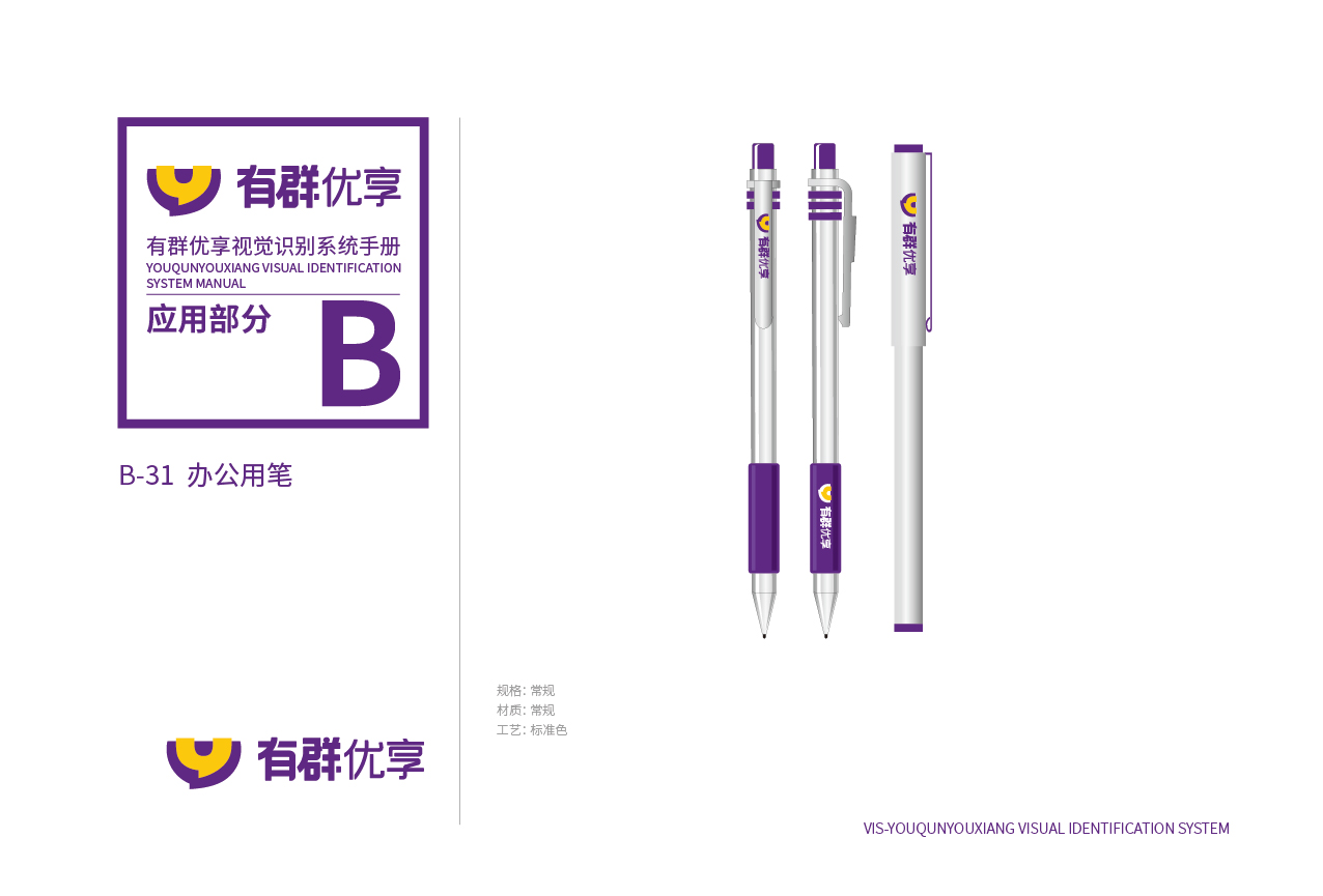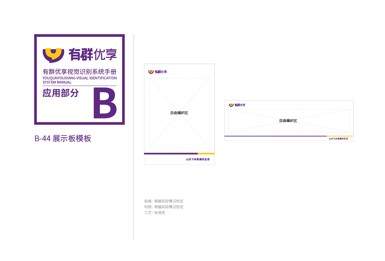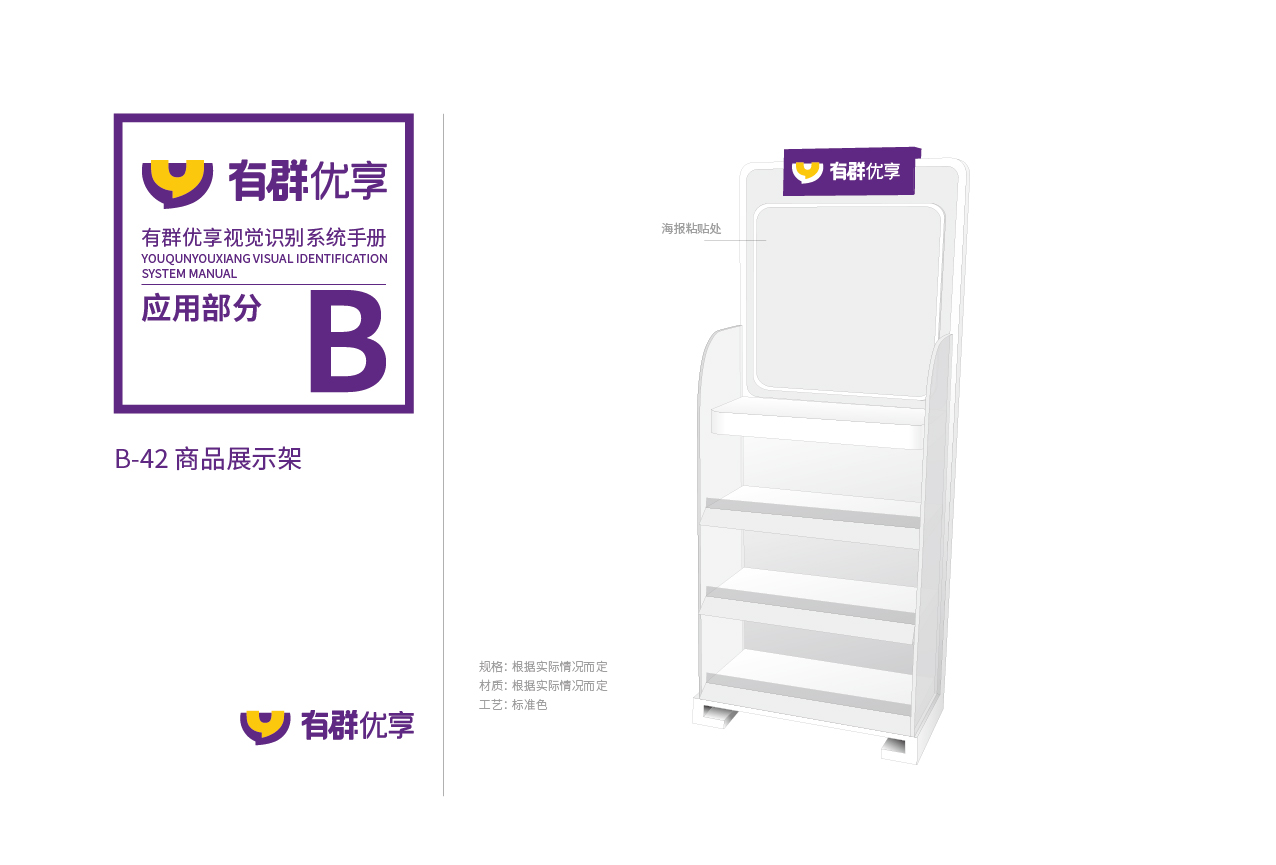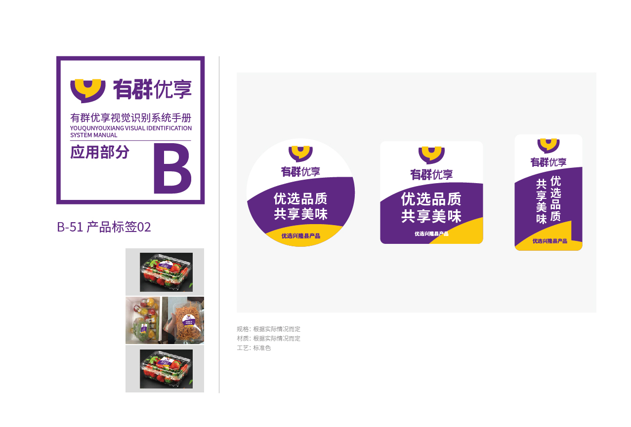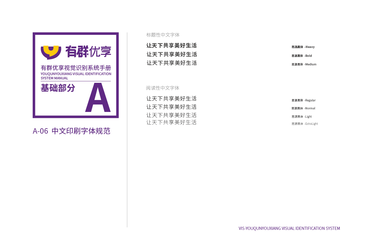 有群優(yōu)享是針對城市居民與農(nóng)民流通農(nóng)產(chǎn)品所建立傳播的品牌名稱。廣告語:讓城市居民與農(nóng)民共享美好生活。而有群創(chuàng)客及有群扶貧是針對企業(yè)內(nèi)部的傳播以及響應(yīng)政府的扶持政策。所以整個品牌的系統(tǒng)聚焦是有群優(yōu)享的視覺傳播。
