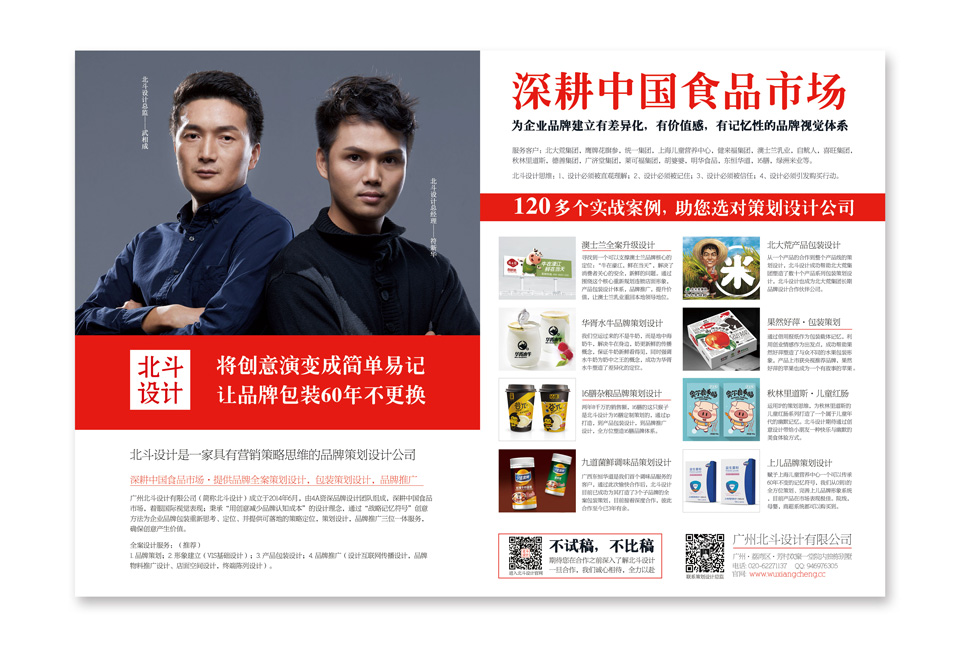 北斗設(shè)計雜志廣告。很高興廣州國際食品展商給了北斗設(shè)計大力支持,給了兩個頁面給我們刊登我們的形象廣告。