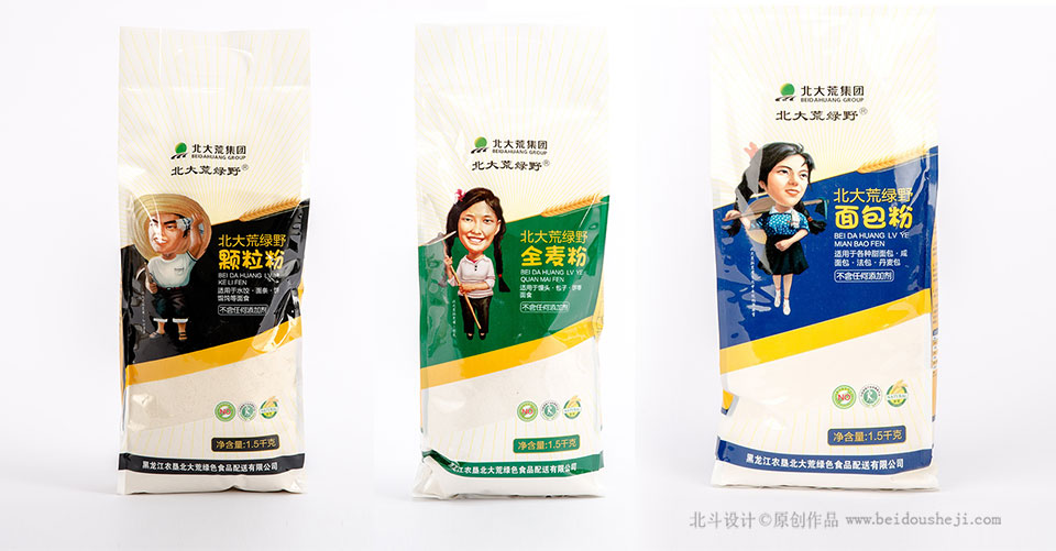 北斗設(shè)計(jì)并不是一開始就與北大荒集團(tuán)簽訂了年度合作,雖然是口碑介紹,但是我們前期的設(shè)計(jì)項(xiàng)目還是從一個(gè)版塊開始,我記得非常清楚第一個(gè)合作案例是:北大荒面粉包裝設(shè)計(jì)項(xiàng)目。那時(shí)候委托我們?cè)O(shè)計(jì)一個(gè)系列共10來個(gè)產(chǎn)品,當(dāng)時(shí)北斗設(shè)計(jì)在于北大荒集團(tuán)品牌經(jīng)理溝通的時(shí)候,希望這次的設(shè)計(jì)能夠從北大荒的歷史及精神方面來提煉產(chǎn)品的元素創(chuàng)意。