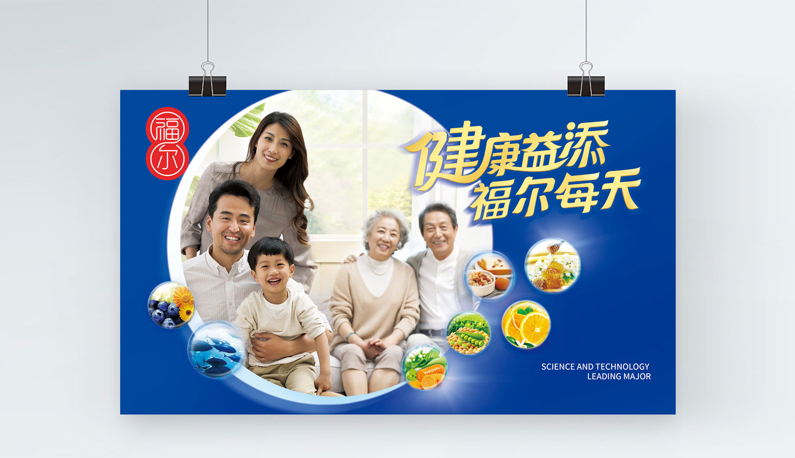 此次海報(bào)設(shè)計(jì)的目的是為了烘托終端產(chǎn)品陳列氣氛而設(shè)計(jì),視覺(jué)表現(xiàn)圍繞全家幸福的景象進(jìn)行創(chuàng)作,整體色調(diào)選用藍(lán)色系,品牌廣告語(yǔ):健康益添,福爾每天,用黃色襯托,下面的圓圈食材圖形,表現(xiàn)保健品的食材屬性。