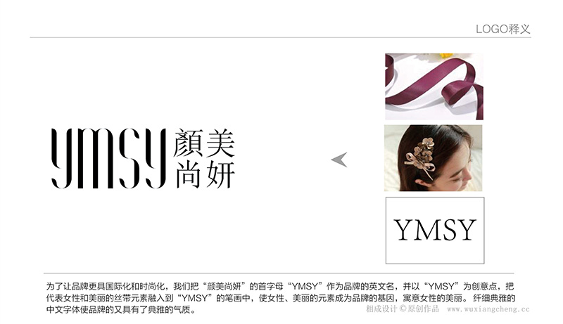 為了讓品牌更具國(guó)際化和時(shí)尚化,相成品牌設(shè)計(jì)師把“顏美尚妍”的首字母“ymsy”作為品品牌的英文名。并以此為創(chuàng)意元素,把代表女性和美麗的絲帶元素融入到“YMSY'的畫筆中,使女性、美麗的元素成為品牌的基因,寓意女性的美麗。纖細(xì)典雅的中文字體使品牌logo設(shè)計(jì)根據(jù)有高貴典雅的氣質(zhì)。