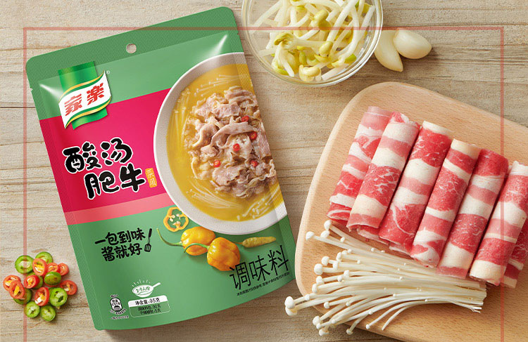 解決品牌的語(yǔ)言后,我們?cè)龠M(jìn)入分析產(chǎn)品屬性語(yǔ)言。產(chǎn)品名稱叫:酸湯肥牛,作為消費(fèi)者第一意向就是希望看到這碗肥牛有多好吃,而不是看您的料有多好。所以設(shè)計(jì)師在這里把食物放大處理,通過(guò)直觀的酸湯肥牛菜品表現(xiàn),讓消費(fèi)者感知它的美味,通過(guò)挑戰(zhàn)并滿足您的視覺(jué)味蕾來(lái)完成您選購(gòu)這款產(chǎn)品。