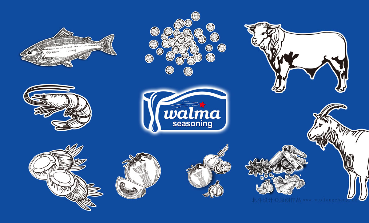 北斗設計觀點:豐裕行作為一家食品公司,我們要盡可能直觀的表達出豐裕行的品類定位,讓品牌包裝設計能夠在第一時間傳達出消費者所需求的信息,通過真實的食物圖片來對每一個產品進行視覺誘惑,讓消費者通過直觀的視覺,體驗到產品的功能屬性。北斗設計從logo的設計,到包裝設計都明確的對walma作為調料品類定位規(guī)劃。比如我們對logo創(chuàng)意的時候,我們想到的是調味料的美味湯汁,廚房里的勺子等作為創(chuàng)意元素。