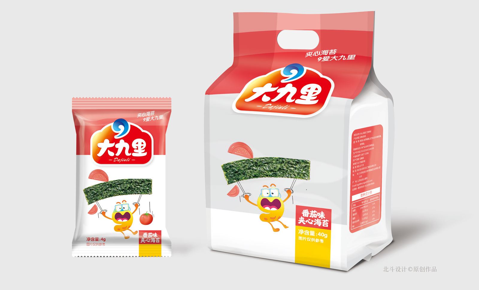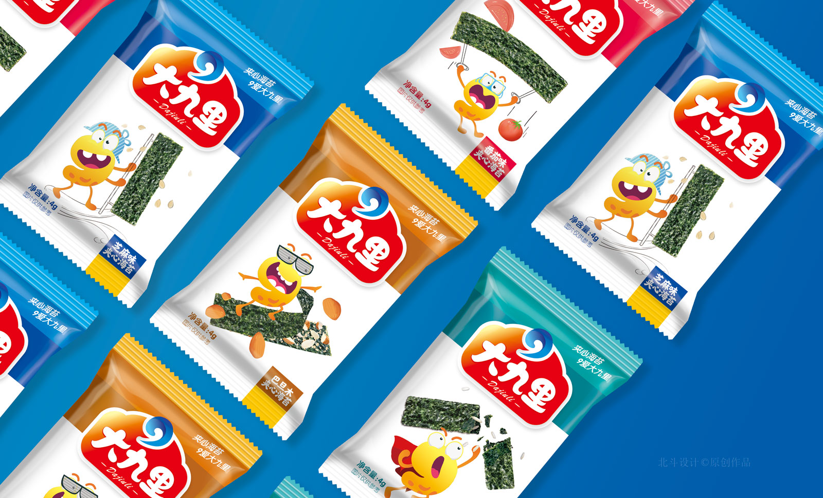 第三:產(chǎn)品包裝設(shè)計的色彩學(xué)。色彩是產(chǎn)品包裝設(shè)計非常重要的一部分,人們在關(guān)注任何一個產(chǎn)品包裝時,首先被他吸引的是色彩,產(chǎn)品包裝設(shè)計的色彩一般結(jié)合產(chǎn)品屬性及品牌形象定位來取用,大九里夾心系列海苔包裝設(shè)計,色彩選用是根據(jù)的是產(chǎn)品的口味屬性來取用。