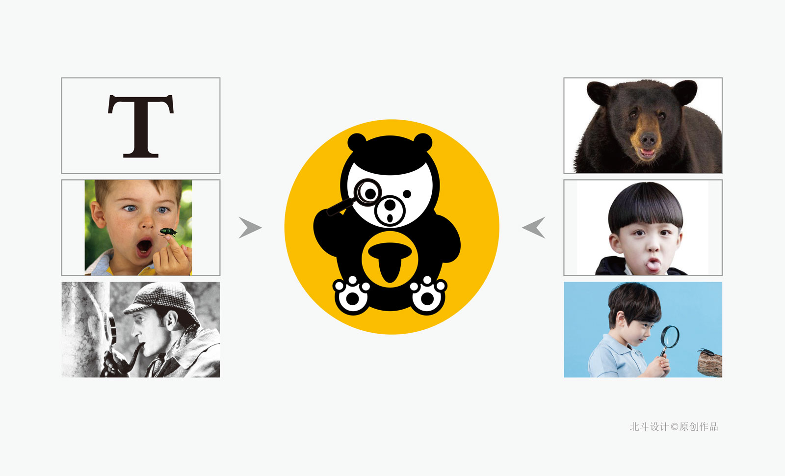 探探熊給我們最直觀的ip就是“熊”,直觀明了,為了讓這只熊更加有趣味及辨識(shí)度,我們給他設(shè)計(jì)了一個(gè)道具“放大鏡”,賦予ip形象與品牌名字的直接聯(lián)系。讓用戶從視覺,到聽覺都直觀明了。