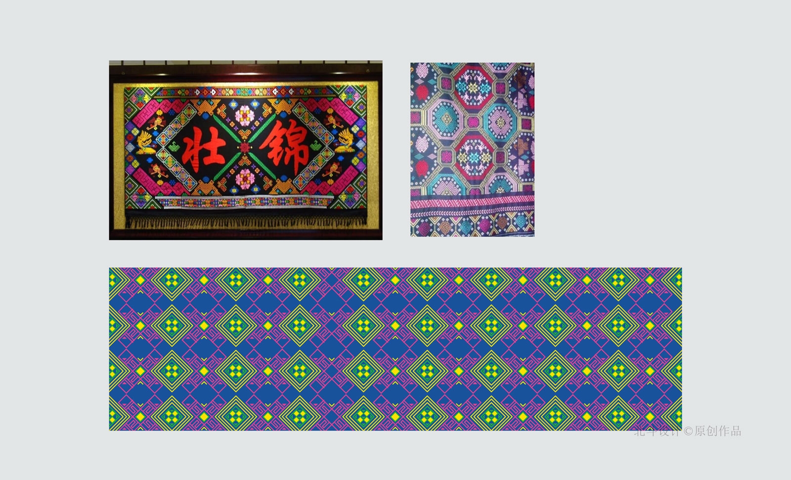 通過對于廣西文化的深入研究,我們選擇了廣西壯族的一種文化圖騰“壯錦”,作為邦蓓優(yōu)品牌的寄生文化圖騰;壯錦,與云錦、蜀錦、宋錦并稱中國四大名錦,據(jù)傳起源于宋代,是中華民族文化瑰寶。我們通過基于產(chǎn)品陳列識別與產(chǎn)品包裝后續(xù)發(fā)揮空間的布置問題,對壯錦圖騰重新設計排布,目的是為了更加契合不同產(chǎn)品包裝載體的陳列,為產(chǎn)品后續(xù)的創(chuàng)意預留更加充沛的發(fā)揮空間。