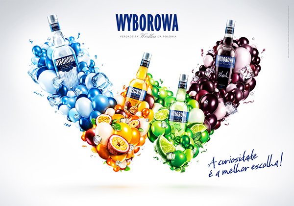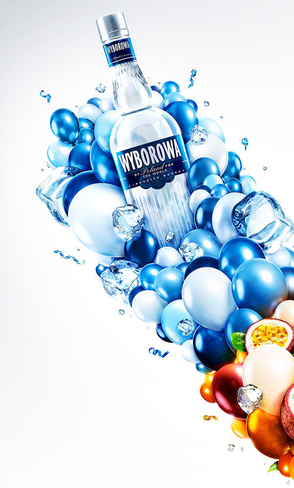 這組食品海報(bào)的創(chuàng)意挑戰(zhàn)在于背景元素的制作,通過(guò)3d建模渲染出靚麗的氣球元素和水果元素,通過(guò)兩者的結(jié)合擺出以一組動(dòng)感的構(gòu)圖,從而體現(xiàn)了WYBOROWA的年輕時(shí)尚的概念。