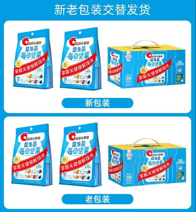 尤其在藍(lán)色包裝上掛一個小藍(lán)袋,更想是強加的“掛羊頭賣狗肉”,我第一次看到這個包裝的時候就特別不舒服。同時禮盒設(shè)計也是一樣,為了跟隨洽洽的換色系,在藍(lán)色禮盒上做了一塊大大的黃色,對比是有了,品牌關(guān)聯(lián)是有了,但是你有想過美學(xué)體驗感嗎?你可能會說,管它呢?賣貨最重要,我只能說你說的對,但是物質(zhì)與精神文化是我們這個時代的消費者應(yīng)該享受的。