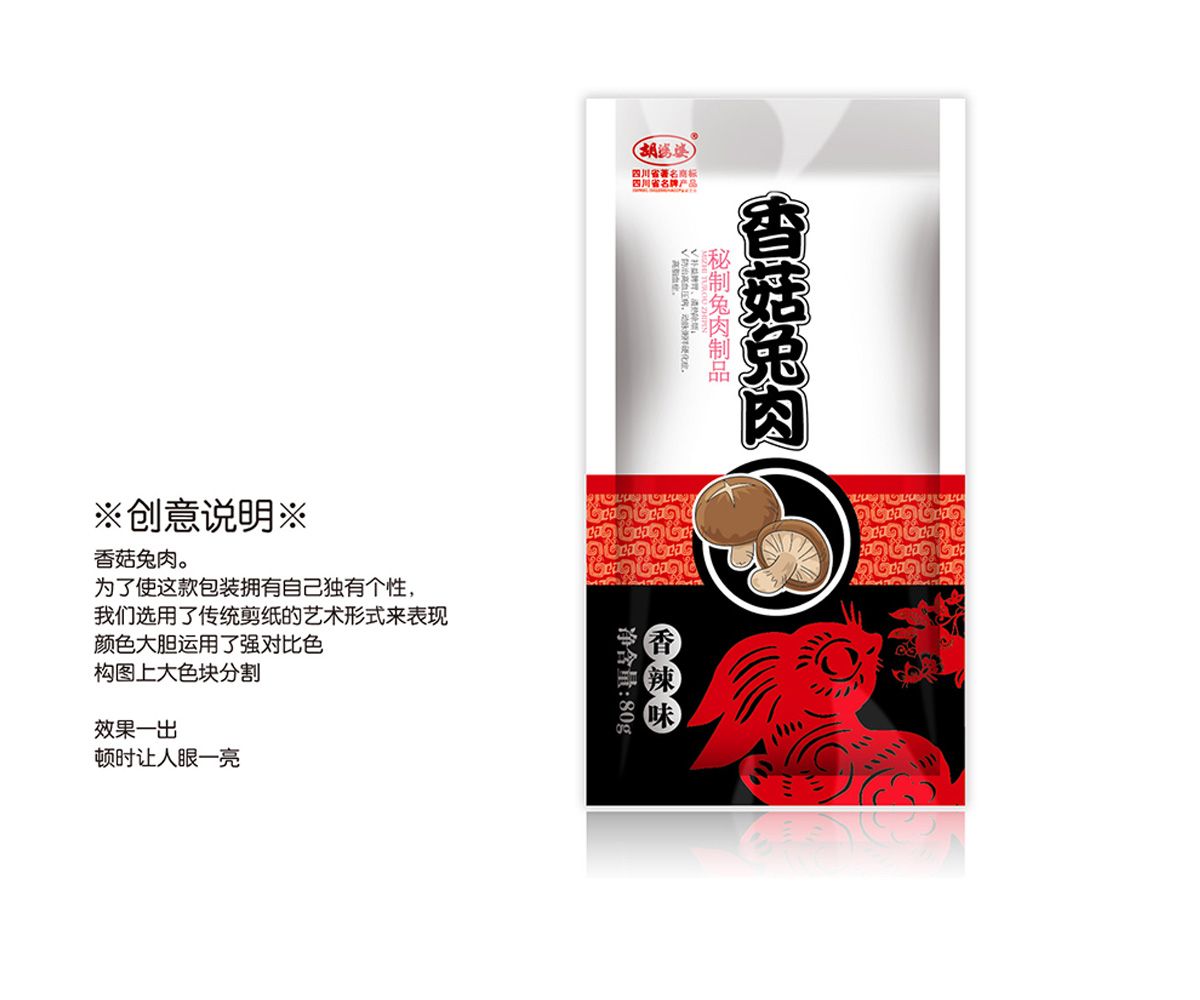 比如相成品牌設(shè)計(jì)塑造的這款胡婆婆品牌香菇兔肉豆干食品包裝設(shè)計(jì)