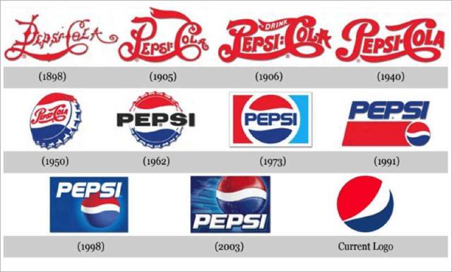 百事可樂(lè)的logo也一直在做減法,從1898年繁復(fù)的英文花字體,到近年最簡(jiǎn)潔的三色瓶蓋,很明顯是簡(jiǎn)潔的圖像傳播比文字更有力量。