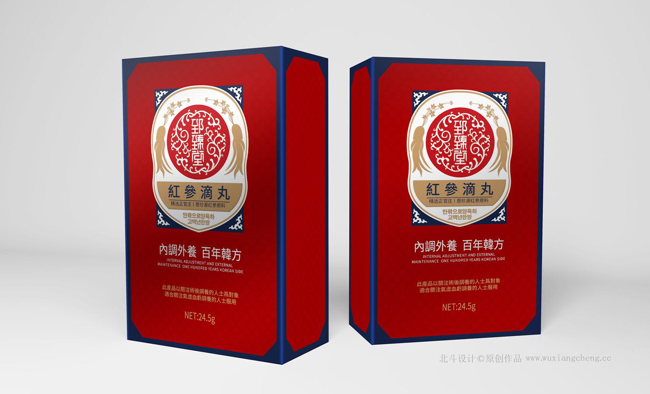 此次合作的新款產(chǎn)品包裝設(shè)計是:紅參滴丸。面對消費(fèi)者群體中老年,原料供應(yīng)商:韓國正官莊。