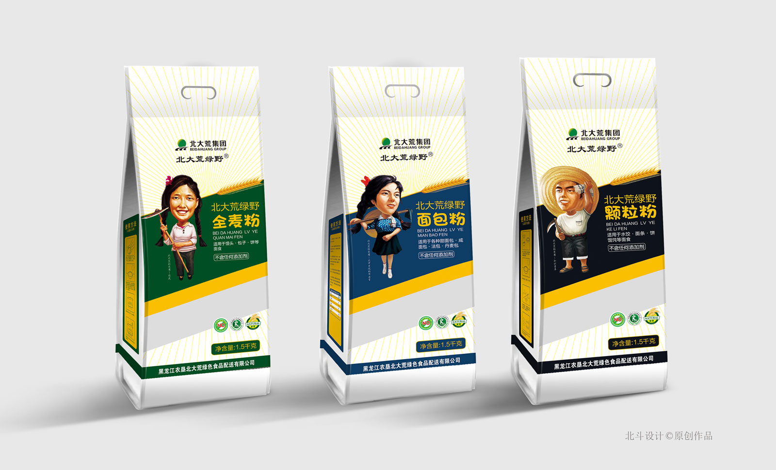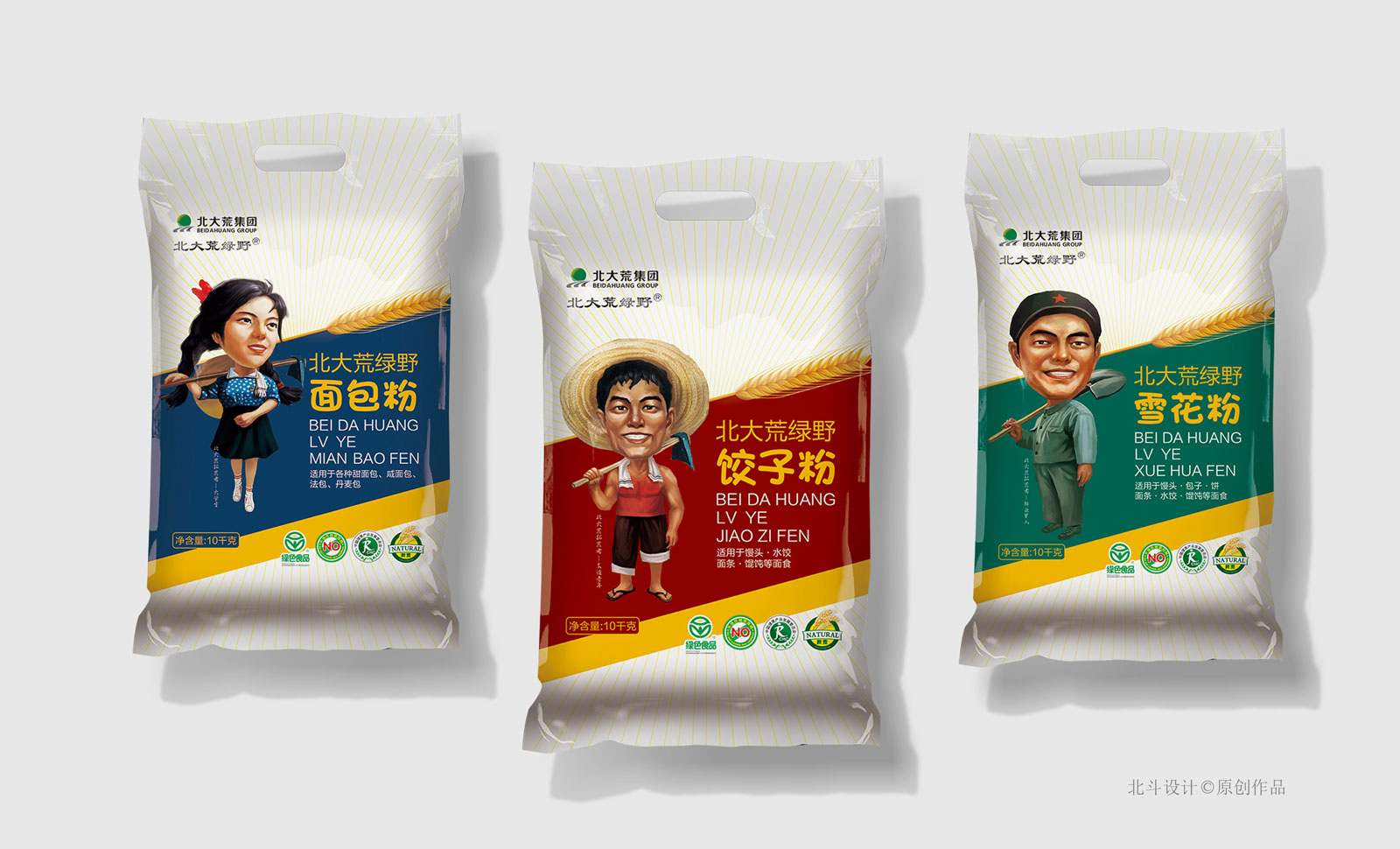 而此次北大荒集團(tuán)旗下北大荒綠野與廣州北斗品牌設(shè)計合作的設(shè)計項目是:麥粉(面粉)系列包裝整合規(guī)劃設(shè)計。這是北斗設(shè)計與北大荒集團(tuán)首次接洽的項目,這個項目是我們的客戶“十六膳”韓總所介紹,在我們深入的了解了北大荒的開墾文化。想把北大荒的開墾文化作為創(chuàng)意的表現(xiàn)方向,最后與客戶不某而合。