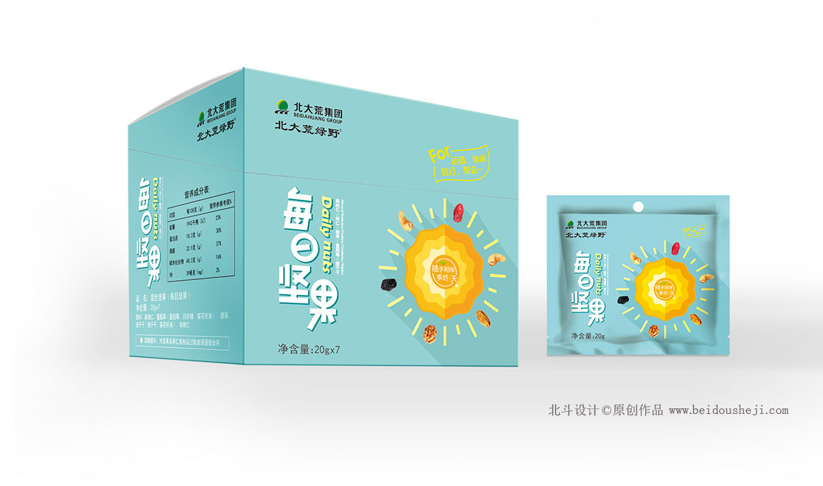 在這次的堅(jiān)果包裝設(shè)計(jì)上,北斗品牌設(shè)計(jì)根據(jù)每日?qǐng)?jiān)果的品牌定位提煉了品牌的包裝視覺符號(hào)——太陽(yáng)。