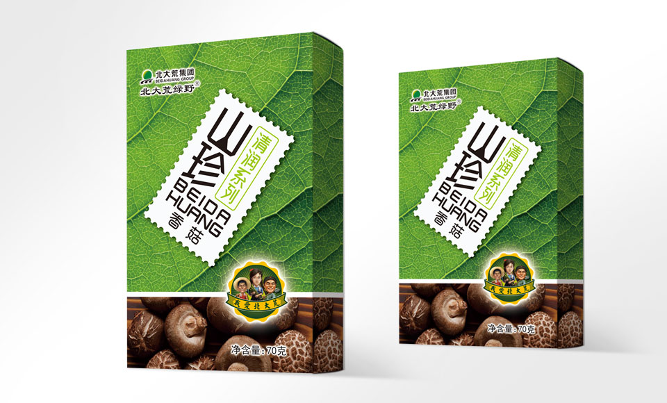 山珍野味大部分是需要大山森林里長出來,多半屬于天然有機(jī)菌體,營養(yǎng)價(jià)值非常之高。這里使用綠葉的自然紋理作為品牌包裝的記憶符號(hào),目的是為了能夠更接近于自然來展現(xiàn)出產(chǎn)品的健康營養(yǎng)屬性。所以在此我們使用了綠葉作為大面積運(yùn)用,構(gòu)成有力的符號(hào)記憶。這種表現(xiàn)手法在同類山珍領(lǐng)域里,北大荒集團(tuán)是第一家啟用這種包裝設(shè)計(jì)表現(xiàn)手法,所以能夠和同類產(chǎn)品脫穎而出,讓消費(fèi)者在購買第一次后便可記住這款產(chǎn)品。