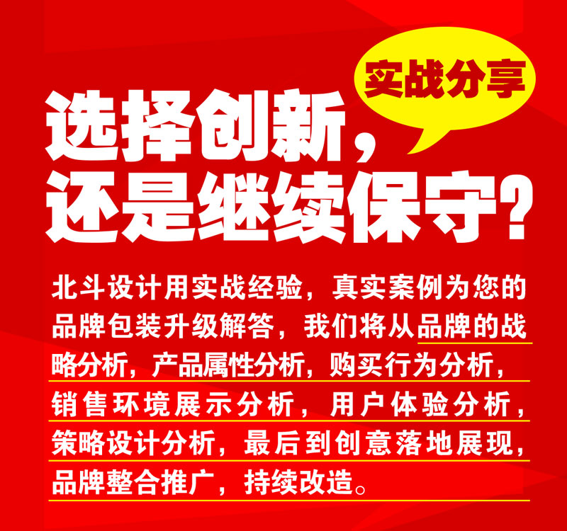北斗設(shè)計(jì)用實(shí)戰(zhàn)經(jīng)驗(yàn),真實(shí)案例為您的品牌包裝升級解答,我們將從品牌的戰(zhàn)略分析,產(chǎn)品屬性分析,購買行為分析,銷售環(huán)境展示分析,用戶體驗(yàn)分析,