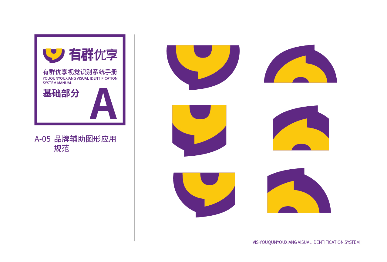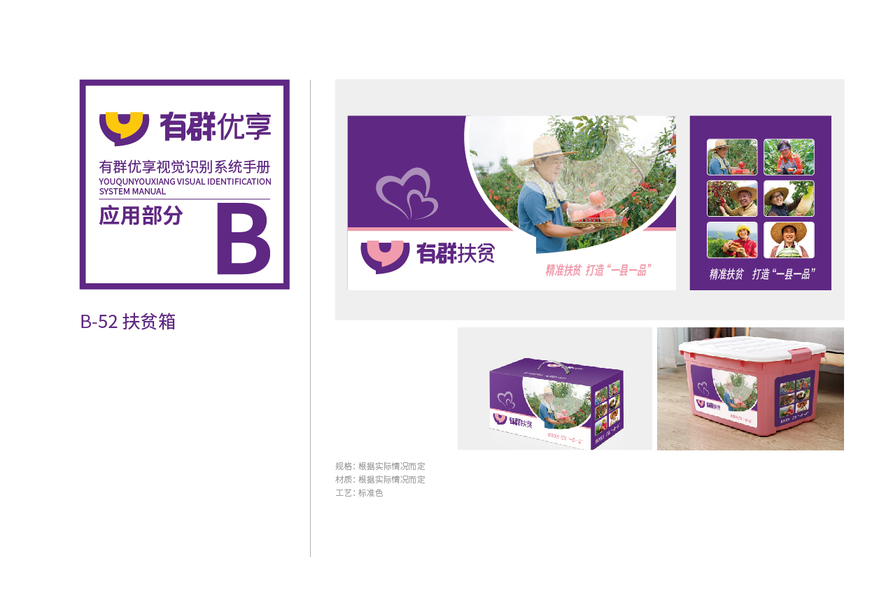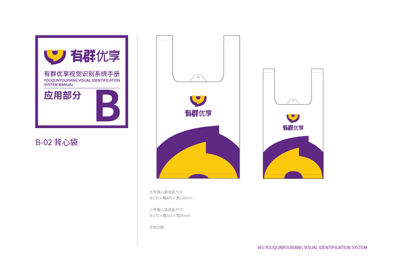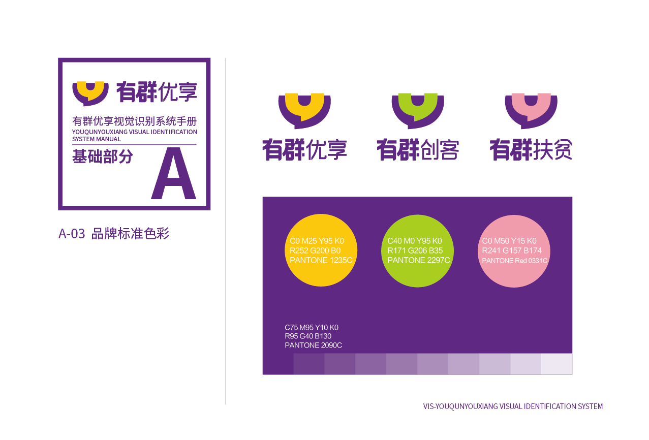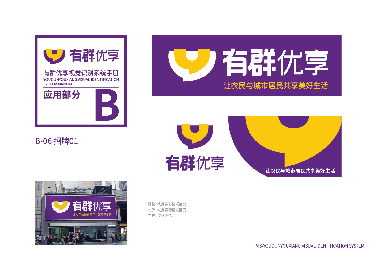 有群優(yōu)享是針對城市居民與農(nóng)民流通農(nóng)產(chǎn)品所建立傳播的品牌名稱。廣告語:讓城市居民與農(nóng)民共享美好生活。而有群創(chuàng)客及有群扶貧是針對企業(yè)內(nèi)部的傳播以及響應(yīng)政府的扶持政策。所以整個品牌的系統(tǒng)聚焦是有群優(yōu)享的視覺傳播。