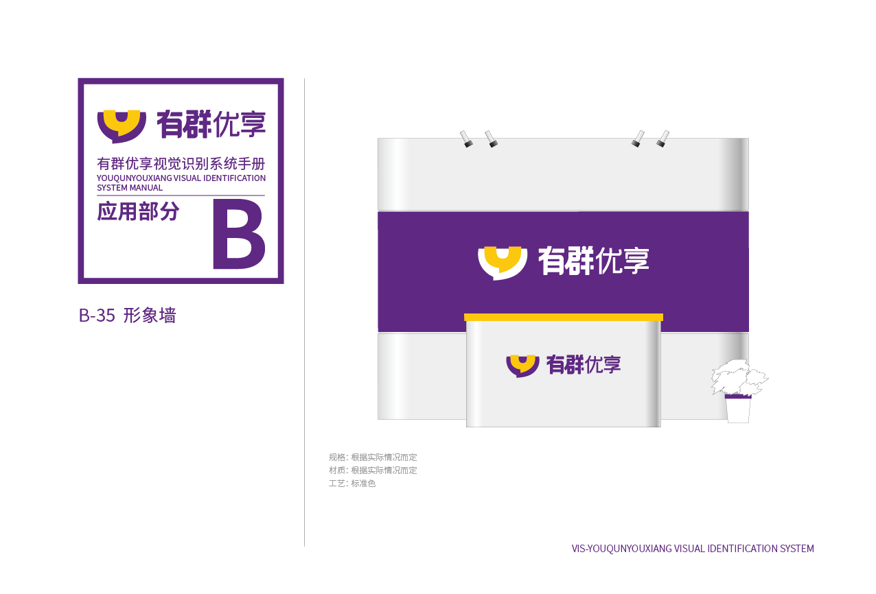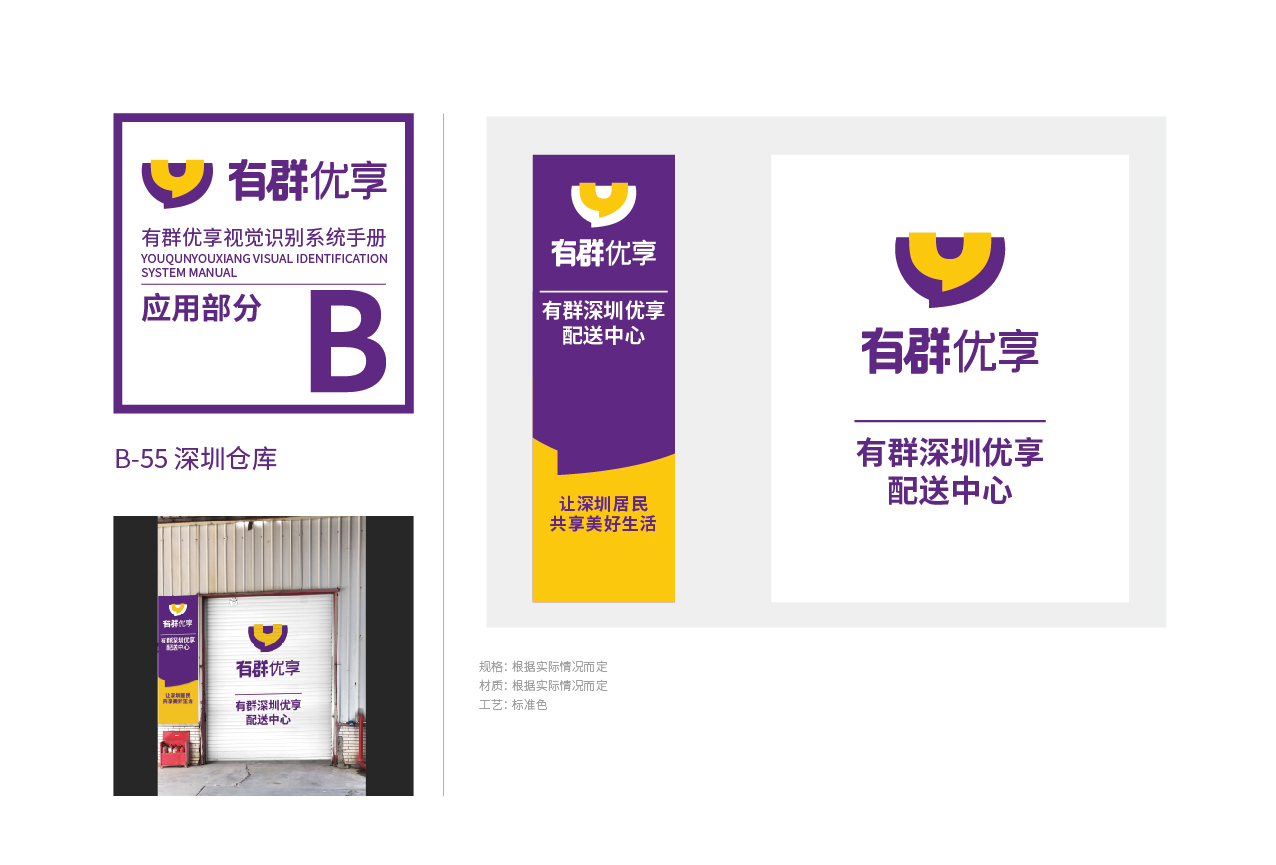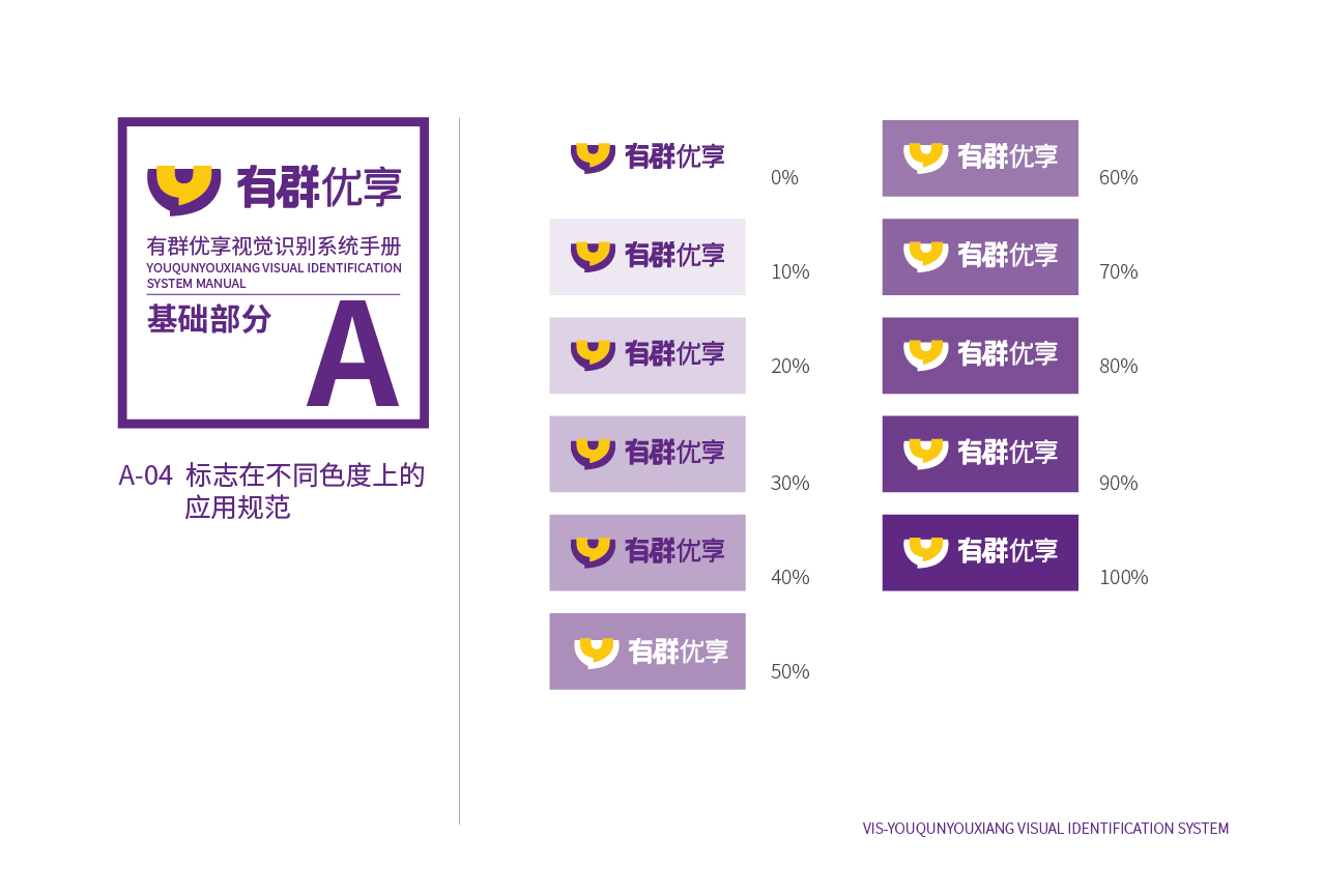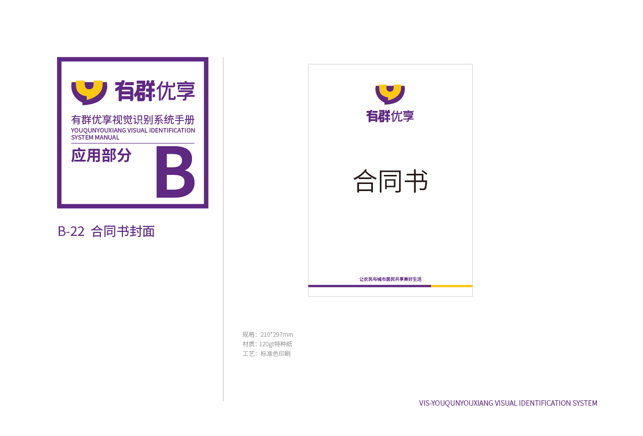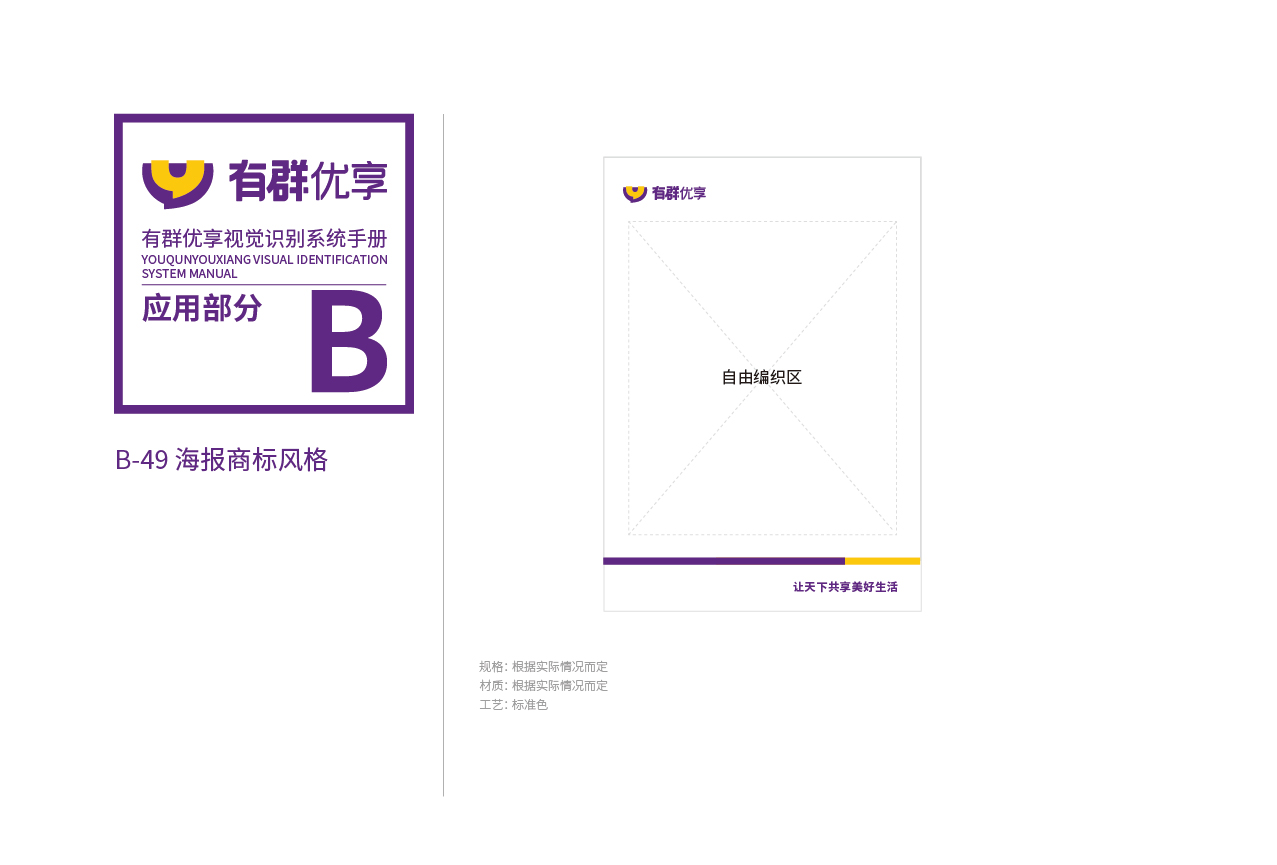 有群優(yōu)享是針對城市居民與農(nóng)民流通農(nóng)產(chǎn)品所建立傳播的品牌名稱。廣告語:讓城市居民與農(nóng)民共享美好生活。而有群創(chuàng)客及有群扶貧是針對企業(yè)內(nèi)部的傳播以及響應(yīng)政府的扶持政策。所以整個品牌的系統(tǒng)聚焦是有群優(yōu)享的視覺傳播。