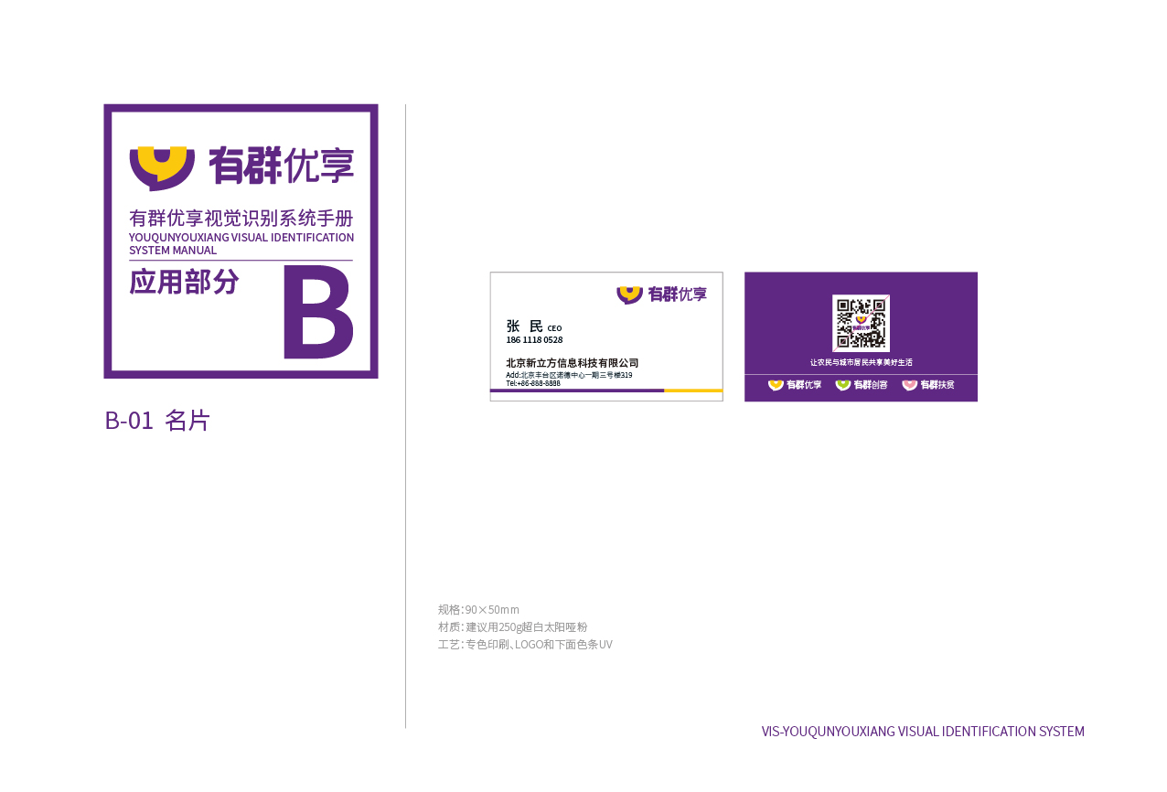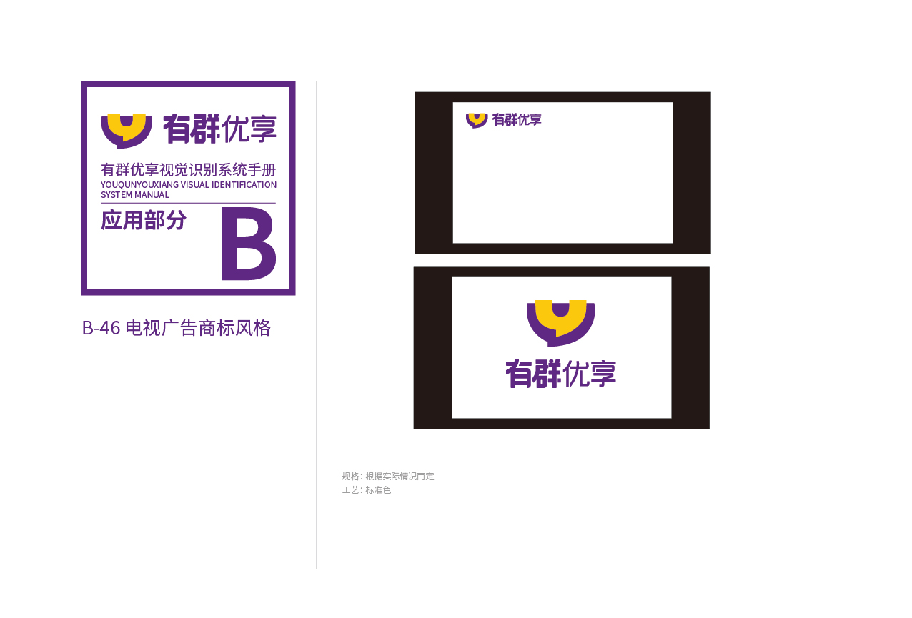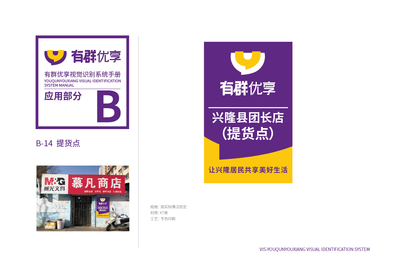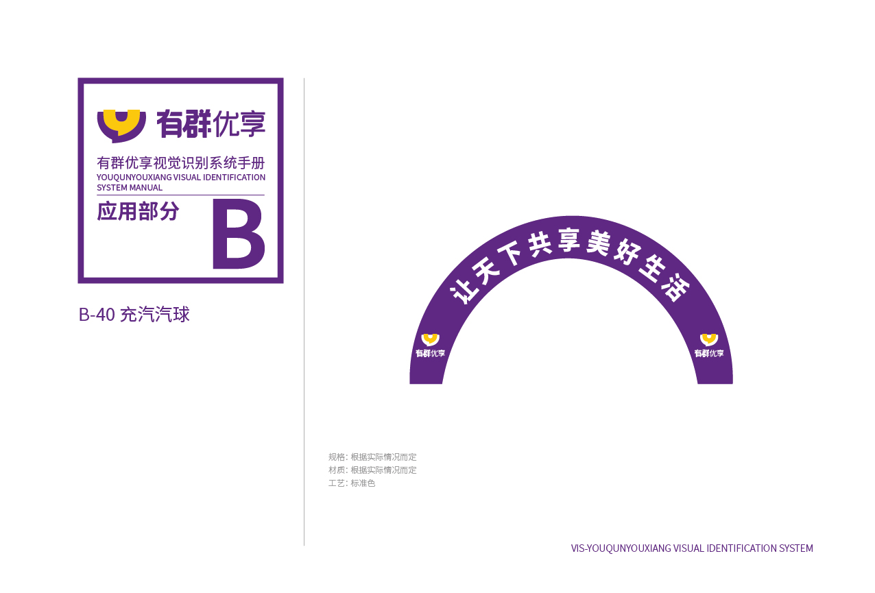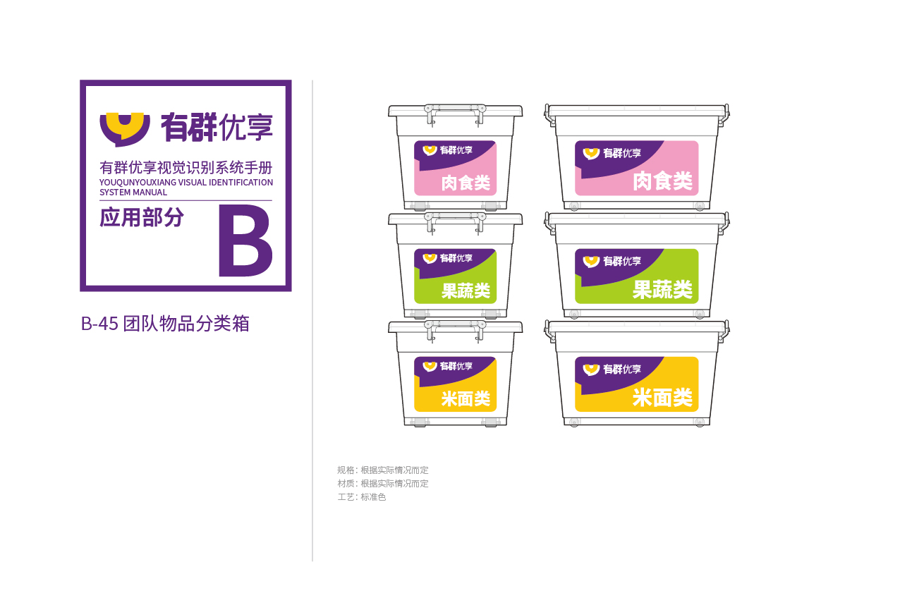 有群優(yōu)享是針對城市居民與農(nóng)民流通農(nóng)產(chǎn)品所建立傳播的品牌名稱。廣告語:讓城市居民與農(nóng)民共享美好生活。而有群創(chuàng)客及有群扶貧是針對企業(yè)內(nèi)部的傳播以及響應(yīng)政府的扶持政策。所以整個品牌的系統(tǒng)聚焦是有群優(yōu)享的視覺傳播。
