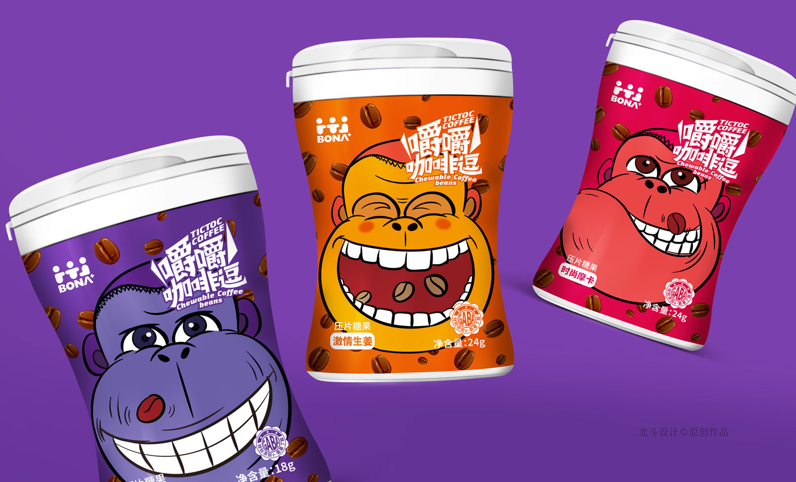慶祝嚼嚼咖啡逗壓片糖果新品上線!此次新品包裝設(shè)計由北斗設(shè)計策劃設(shè)計,主要創(chuàng)意策略采用的是ip文化符號來作為產(chǎn)品的記憶特點,通過活潑可愛,愛搞怪的卡通ip賦予產(chǎn)品視覺有趣的體驗,色彩上運用了純厚的色彩來表現(xiàn)咖啡的那種醇厚的味道。