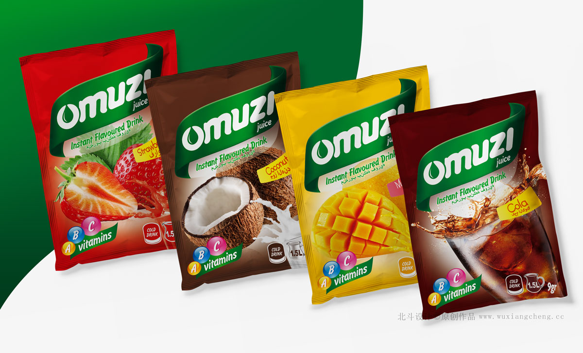 除了品牌的符號(hào)logo,我們接下里思考的是產(chǎn)品的屬性表現(xiàn),對(duì)于omuzi這個(gè)系列產(chǎn)品,我們通過分析后,發(fā)現(xiàn)都是以產(chǎn)不同水果核心成分口味區(qū)分。為此我們將不同的水果作為真實(shí)的口感誘惑,通過食物與與果汁的配合表現(xiàn)不同口感的產(chǎn)品形象。
