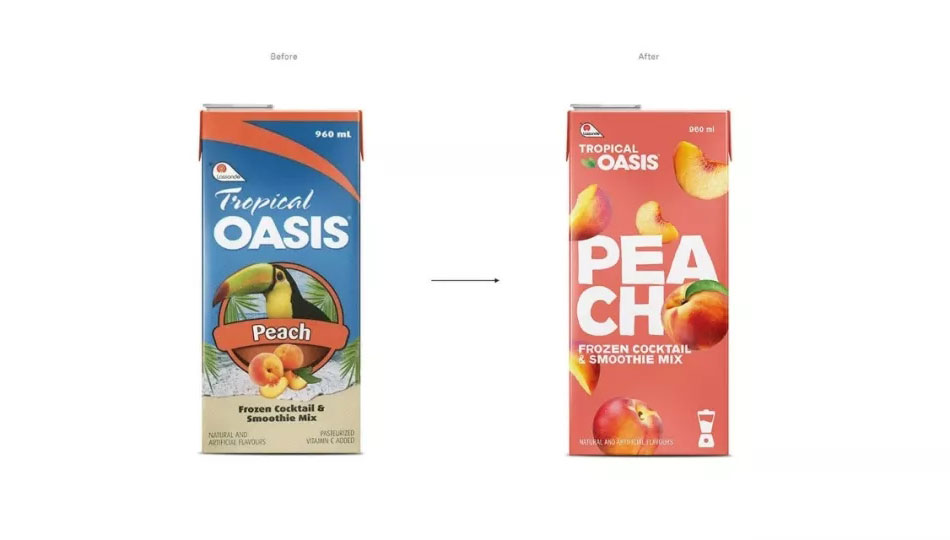 Oasis這是品牌的記憶,那個長嘴鳥是產(chǎn)品符號記憶核心,整個包裝設(shè)計都非常的清晰明了,而且在板式設(shè)計上也是擁有自己的個性,尤其上面的那一塊橙色也是非常好的品牌形象識別。這個包裝設(shè)計完全是可以繼續(xù)使用60年沒有任何問題,即使需要完善升級那也是小改動。本來這個姑娘就很漂亮,也很有氣質(zhì),只是皮膚黑了一點,您就把她全部換臉,換皮,那這個人還是她嗎?即使您把她變成另外一個很有特點的她,那她身邊的朋友都不再認(rèn)識她,而且要重新去認(rèn)識她,這就是品牌建立產(chǎn)生的多余成本。大家看下下面升級完成的包裝設(shè)計,相比較,那個最佳。