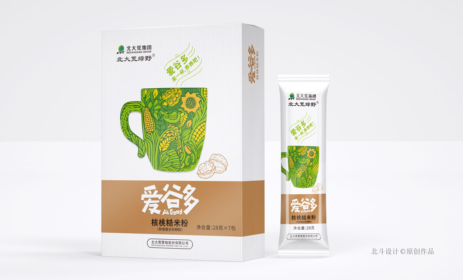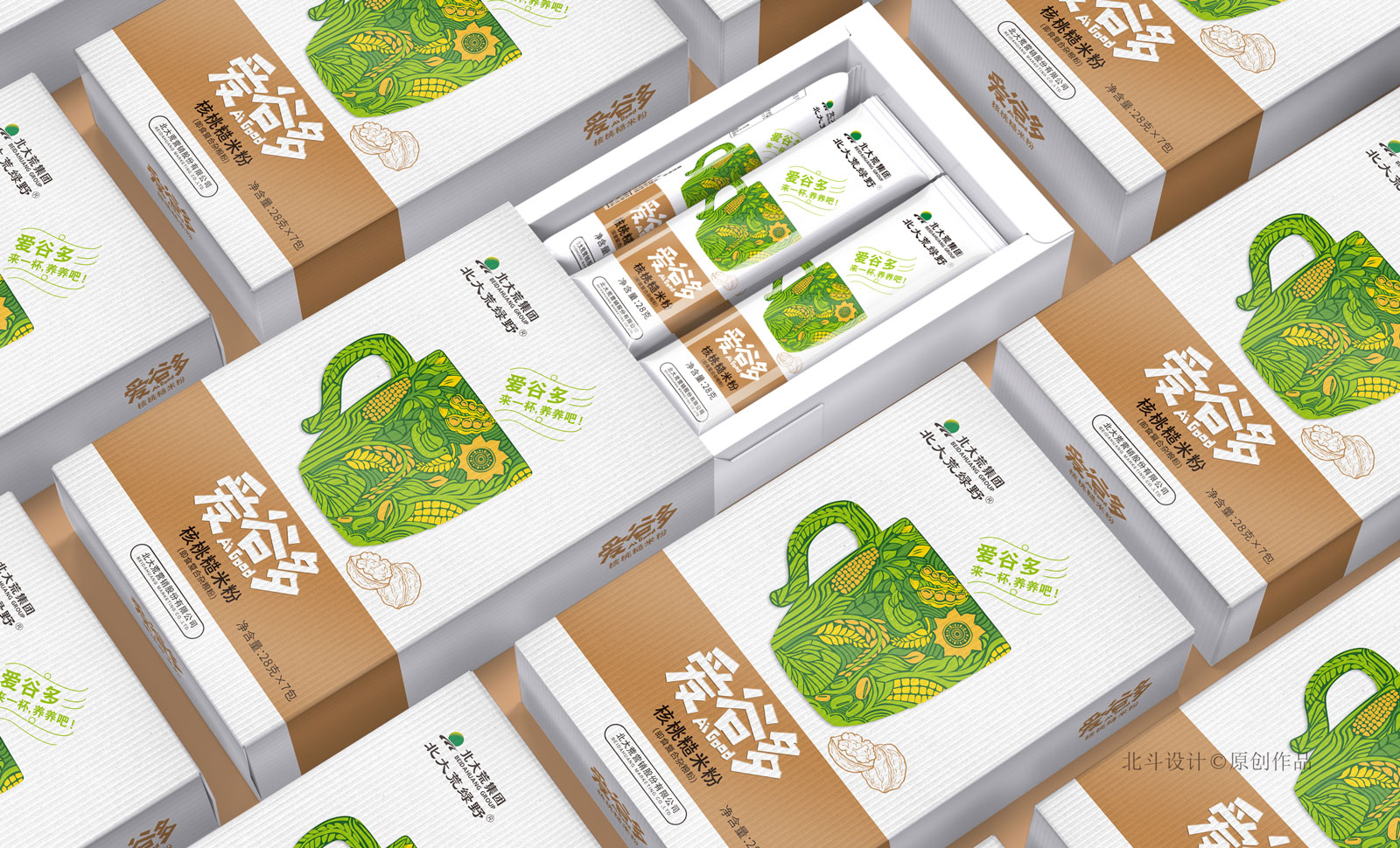 很高興北斗設(shè)計(jì)再次攜手北大荒達(dá)成對(duì)“愛谷多”品牌包裝創(chuàng)意合作。合作內(nèi)容包含:愛谷多品牌logo設(shè)計(jì)和旗下代餐系列的雜糧粉及同熟雜糧系列包裝設(shè)計(jì)。此次合作,客戶的需求很明確:要借用北大荒的品牌背書快速推出這個(gè)系列新品,順便帶動(dòng)子品牌“愛谷多”,渠道都是現(xiàn)有渠道經(jīng)銷商代銷,目的是為了搶占目前雜糧代餐粉的風(fēng)口市場。