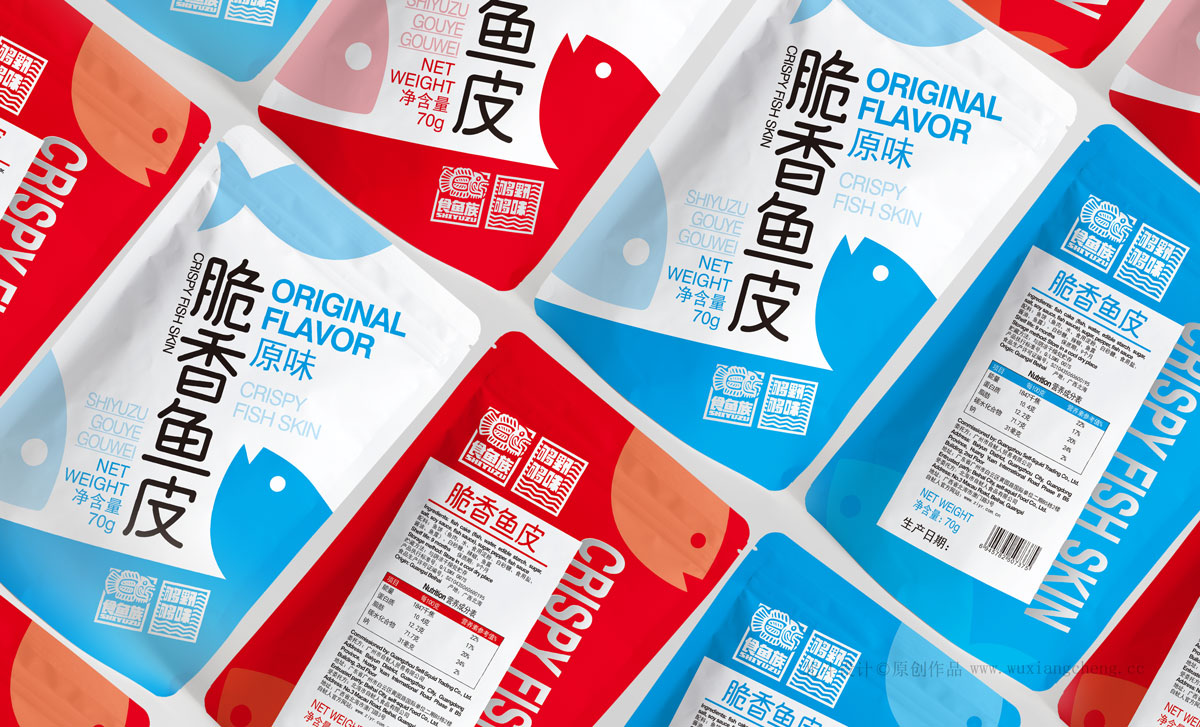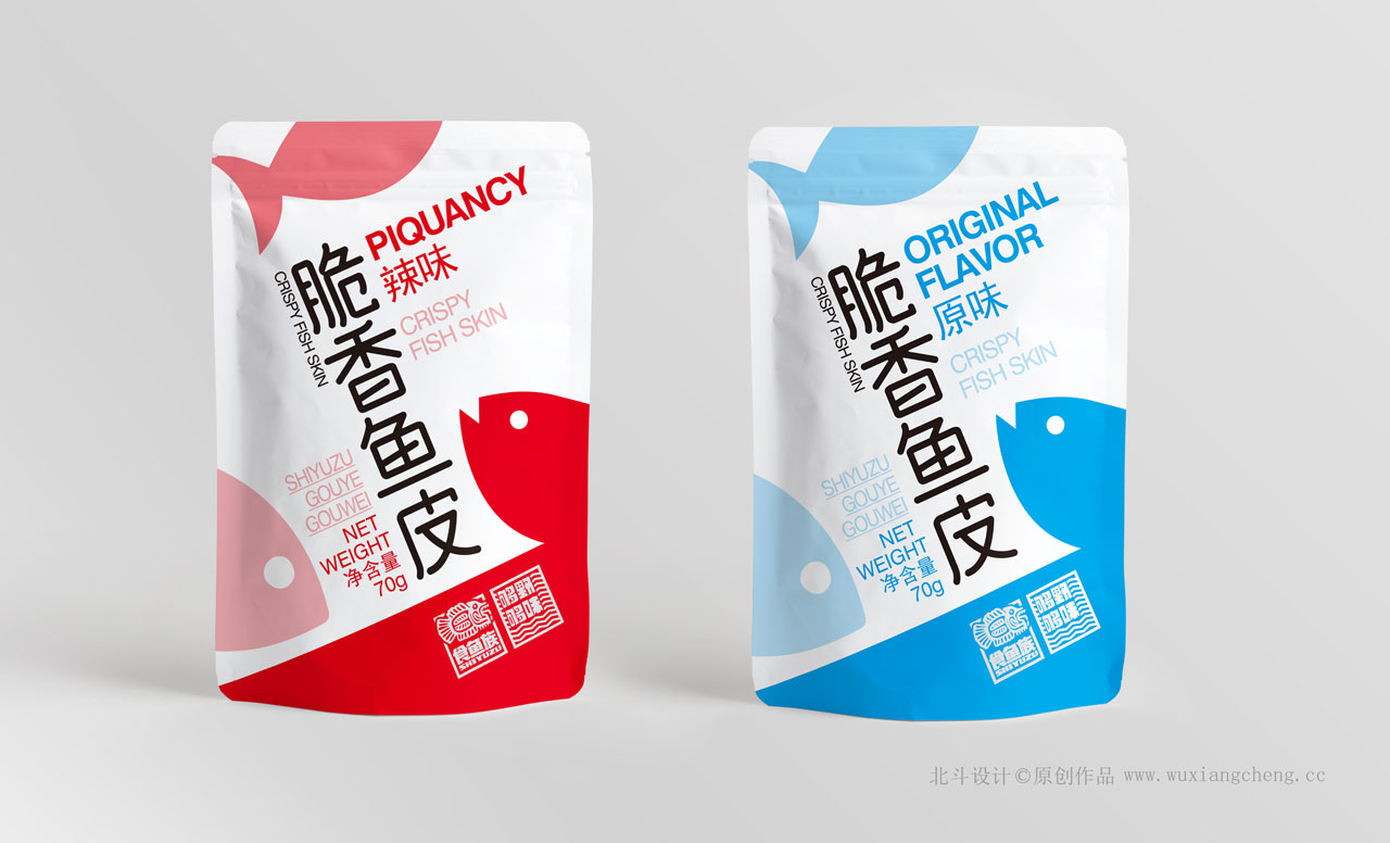 北斗設(shè)計(jì)幫助食魚族規(guī)劃了脆香魚皮系列的包裝設(shè)計(jì)。設(shè)計(jì)風(fēng)格同樣沿用的是食魚族的簡(jiǎn)約時(shí)尚風(fēng)格。通過簡(jiǎn)單的魚仔剪影及個(gè)性的板式設(shè)計(jì),形成食魚族自己的包裝體系特色。