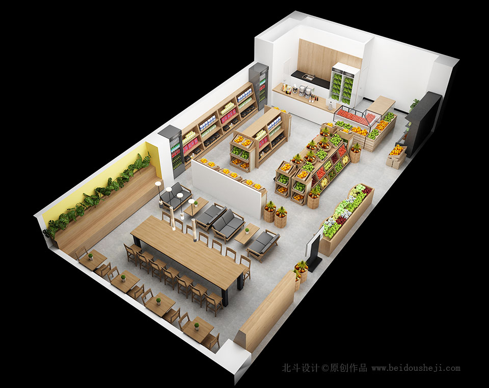 北斗設(shè)計(jì)幫助瓜熟蒂落營(yíng)造的是一種現(xiàn)代風(fēng)格水果體驗(yàn)館。主要功能布局:1.瓜熟蒂落精選水果區(qū)、2.農(nóng)創(chuàng)交流區(qū)、3.進(jìn)口產(chǎn)品區(qū)、4.時(shí)令水果區(qū)。