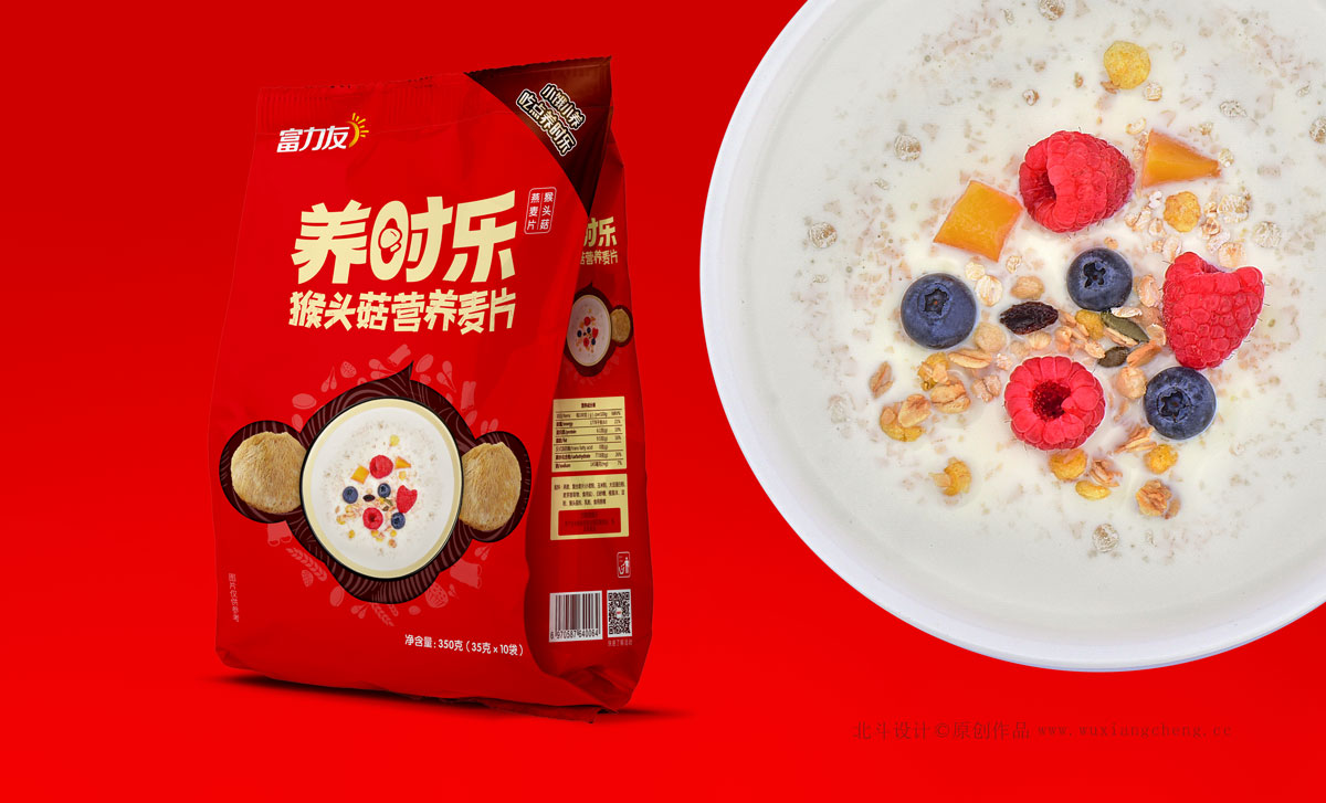 富力友的麥片包裝策劃設(shè)計運(yùn)用了標(biāo)準(zhǔn)紅色系,紅色在節(jié)日豐富的中國市場上是最受歡迎的色系。包裝記憶符號延續(xù)了上面猴頭菇餅干系列的“猴頭”記憶符號,這兩款產(chǎn)品從銷售戰(zhàn)略上,也是屬于搭配產(chǎn)品,符合系列產(chǎn)品延展的策略。