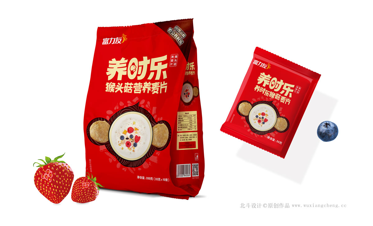 不能一味的求同,需要是從中突破,讓消費(fèi)者注意到你的存在,這樣您才能夠培養(yǎng)出自己的品牌認(rèn)知,形成自己的品牌資產(chǎn)。首先富力友的突破是在記憶符號的創(chuàng)作上,北斗設(shè)計特地為其定制了猴頭的記憶符號,讓富力友猴頭菇餅干,麥片系列包裝視覺上聚焦展現(xiàn),有了自己的符號記憶,接下來就是傳承與推廣了。