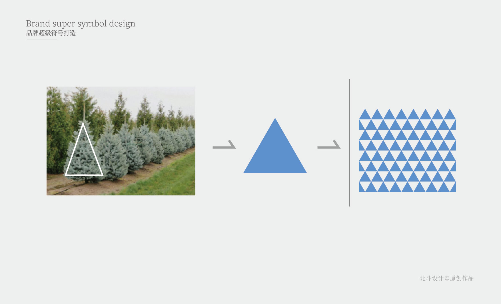 首先我們需要挖掘出藍(lán)杉的品牌符號(hào),作為統(tǒng)一藍(lán)杉品牌旗下所有產(chǎn)品對(duì)外傳播的認(rèn)知符號(hào)。藍(lán)杉取名來源于一種“藍(lán)杉樹”,這種樹形態(tài)如金字塔,喜歡較為涼爽的氣候,對(duì)光照的要求較高。取此名是期望品牌如藍(lán)杉樹一樣,帶給用戶天然的健康環(huán)境。為了更貼合品牌的關(guān)聯(lián)度,我們將提取了“藍(lán)杉樹”的造型作為品牌關(guān)聯(lián)的記憶符號(hào),同時(shí)將這個(gè)符號(hào)運(yùn)用于所有傳播載體上,通過符號(hào)的關(guān)聯(lián)加強(qiáng)品牌及產(chǎn)品的認(rèn)知記憶。