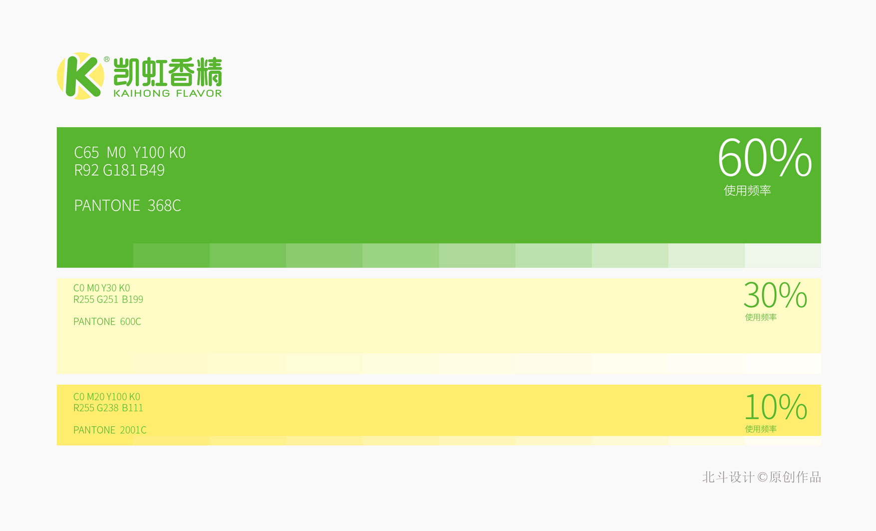 首先是對于現(xiàn)有l(wèi)ogo的升級,在原有l(wèi)ogo的基礎(chǔ)上,我們將凱虹香精的字體做了全新的修善設(shè)計(jì),以及圖形的改造變得更整體簡潔。色彩制定保持原有的綠色,外加淡黃色及金色作為輔助顏色。