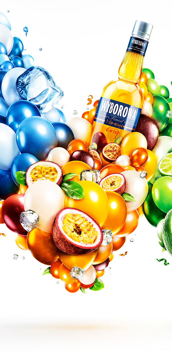 這組食品海報(bào)的創(chuàng)意挑戰(zhàn)在于背景元素的制作,通過(guò)3d建模渲染出靚麗的氣球元素和水果元素,通過(guò)兩者的結(jié)合擺出以一組動(dòng)感的構(gòu)圖,從而體現(xiàn)了WYBOROWA的年輕時(shí)尚的概念。