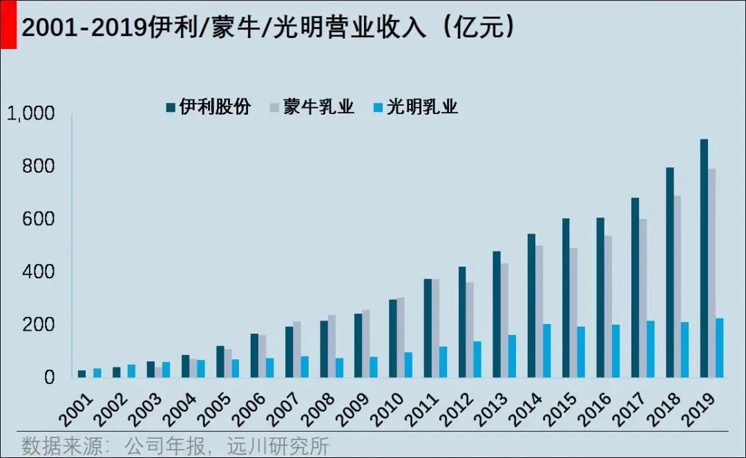 1996年,上海以“光明牌”為基礎,組建了光明乳業(yè),憑借上海及華東市場的購買力,光明的高價低溫奶銷路大開。到2002年光明上市時,其主營收入高達50.21億元,遠超伊利的40億元和蒙牛的16.68億元,其牛奶在國內的產銷量、收入及市占率均是第一。