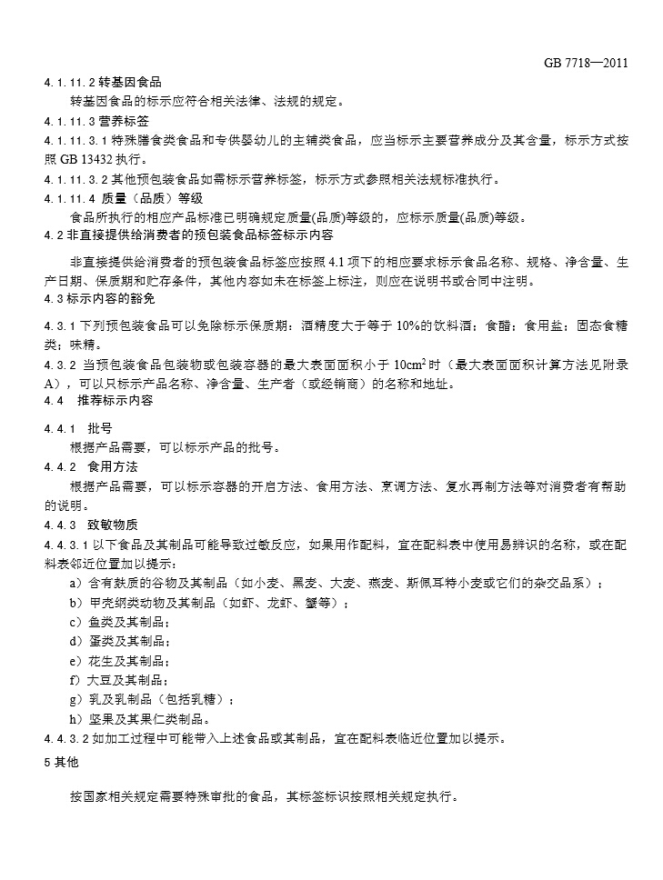 本標準代替GB 7718-2004《預包裝食品標簽通則》。 本標準與GB 7718-2004相比,主要變化如下: ——修改了適用范圍; ——修改了預包裝食品和生產(chǎn)日期的定義,增加了規(guī)格的定義,取消了保存期的定義; ——修改了食品添加劑的標示方式; ——增加了規(guī)格的標示方式; ——修改了生產(chǎn)者、經(jīng)銷者的名稱、地址和聯(lián)系方式的標示方式; ——修改了強制標示內(nèi)容的文字、符號、數(shù)字的高度不小于1.8mm時的包裝物或包裝容器的最大表 面面積; ——增加了食品中可能含有致敏物質時的推薦標示要求; ——修改了附錄A中最大表面面積的計算方法; ——增加了附錄B和附錄C。